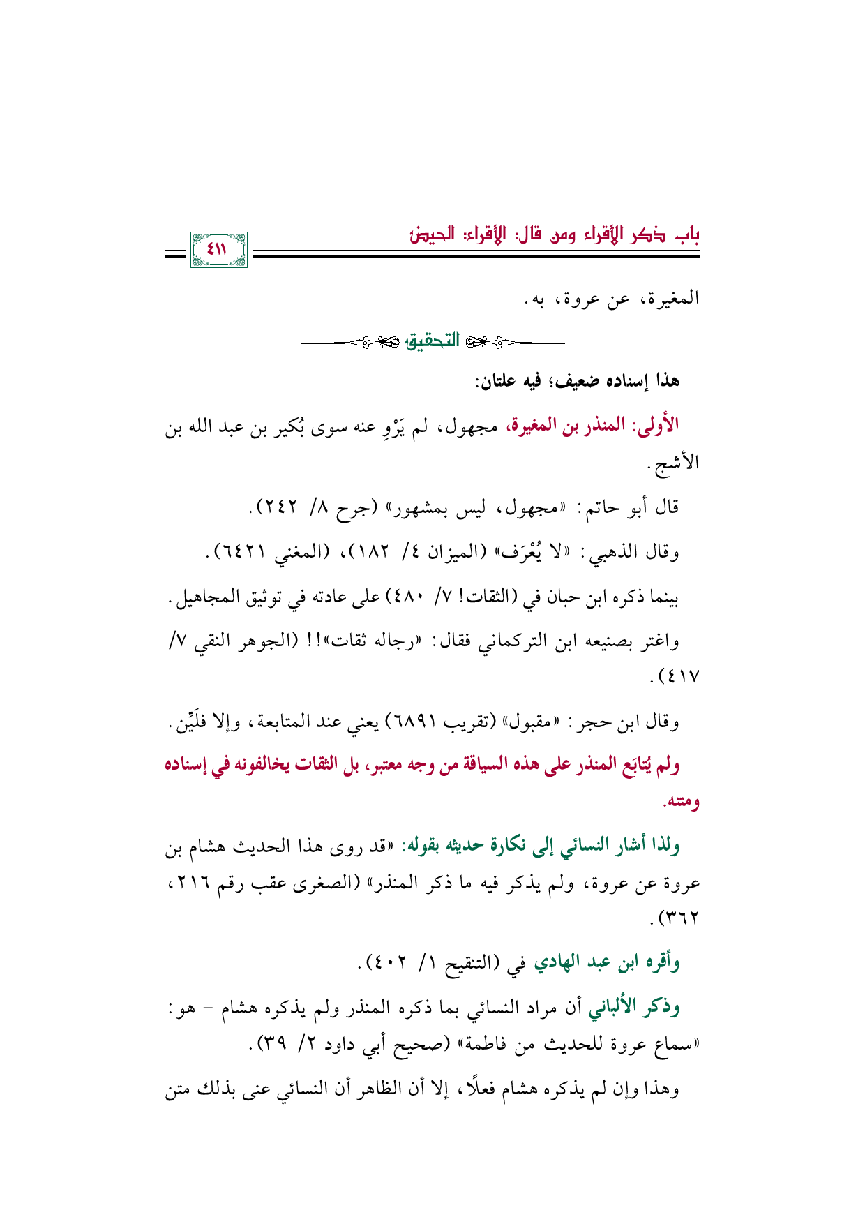 وذكر الألباني أن مراد النسائي بما ذكره المنذر ولم يذكره هشام- هو: ((سماع عروة للحديث من فاطمة)) (صحيح أبي داود ٢/ ٣٩).