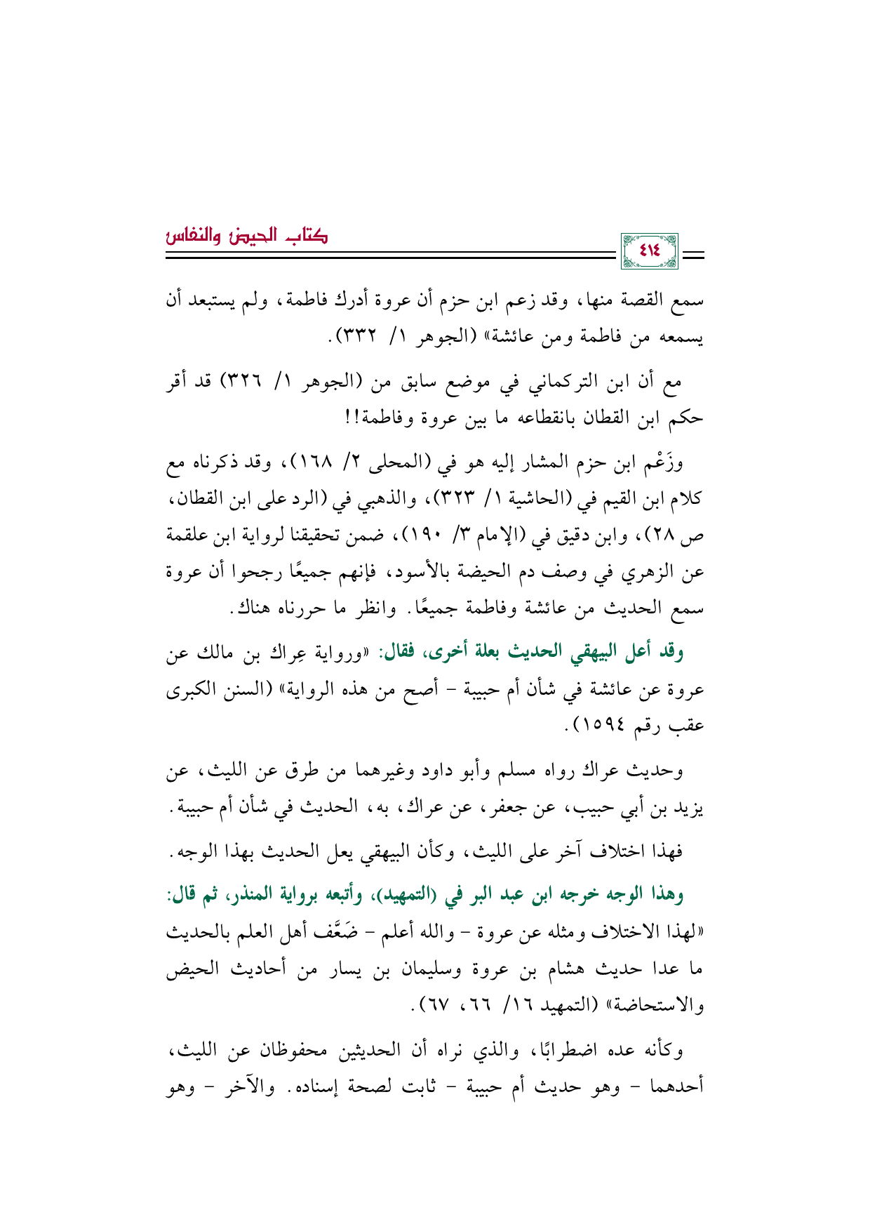 وزَعْم ابن حزم المشار إليه هو في (المحلى ٢/ ١٦٨)، وقد ذكرناه مع كلام ابن القيم في (الحاشية ١/ ٣٢٣)، والذهبي في (الرد على ابن القطان، ص ٢٨)، وابن دقيق في (الإمام ٣/ ١٩٠)، ضمن تحقيقنا لرواية ابن علقمة عن الزهري في وصف دم الحيضة بالأسود، فإنهم جميعًا رجحوا أن عروة سمع الحديث من عائشة وفاطمة جميعًا. وانظر ما حررناه هناك.