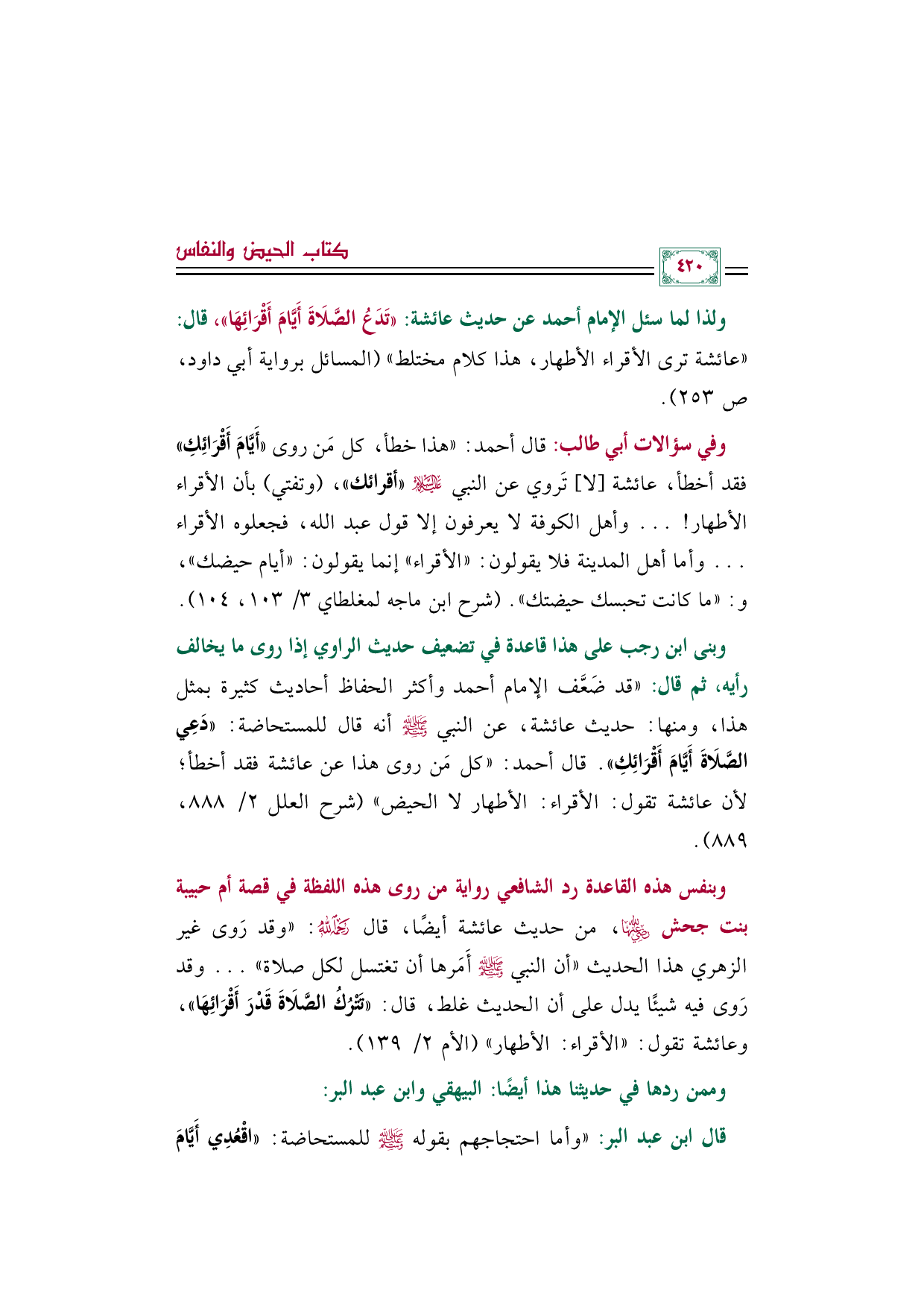 وفي سؤالات أبي طالب: قال أحمد: ((هذا خطأ، كل مَن روى ((أَيَّامَ أَقْرَائِكِ)) فقد أخطأ، عائشة [لا] تَروي عن النبي عليه السلام ((أقرائك))، (وتفتي) بأن الأقراء الأطهار! ... وأهل الكوفة لا يعرفون إلا قول عبد الله، فجعلوه الأقراء ... وأما أهل المدينة فلا يقولون: ((الأقراء)) إنما يقولون: ((أيام حيضك))، و: ((ما كانت تحبسك حيضتك)). (شرح ابن ماجه لمغلطاي ٣/ ١٠٣، ١٠٤).