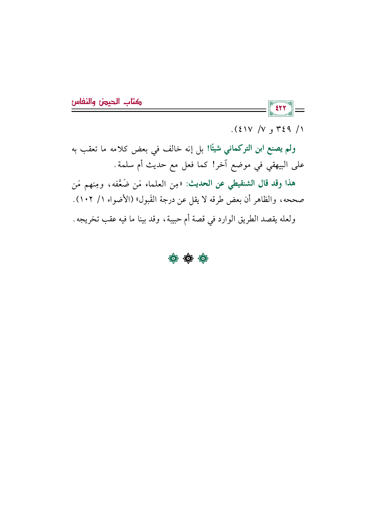ولم يصنع ابن التركماني شيئًا! بل إنه خالف في بعض كلامه ما تعقب به على البيهقي في موضع آخر! كما فعل مع حديث أم سلمة.