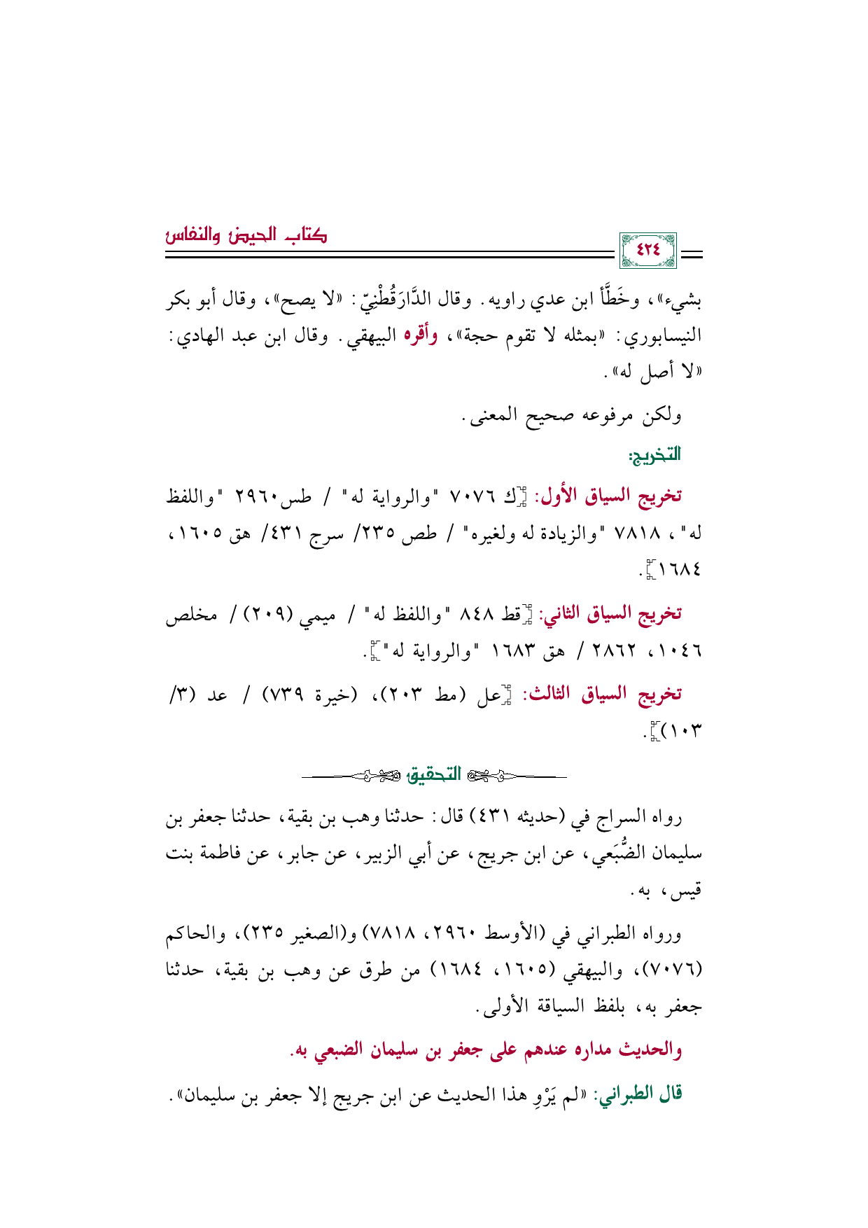 رواه السراج في (حديثه ٤٣١) قال: حدثنا وهب بن بقية، حدثنا جعفر بن سليمان الضُّبَعي، عن ابن جريج، عن أبي الزبير، عن جابر، عن فاطمة بنت قيس، به.