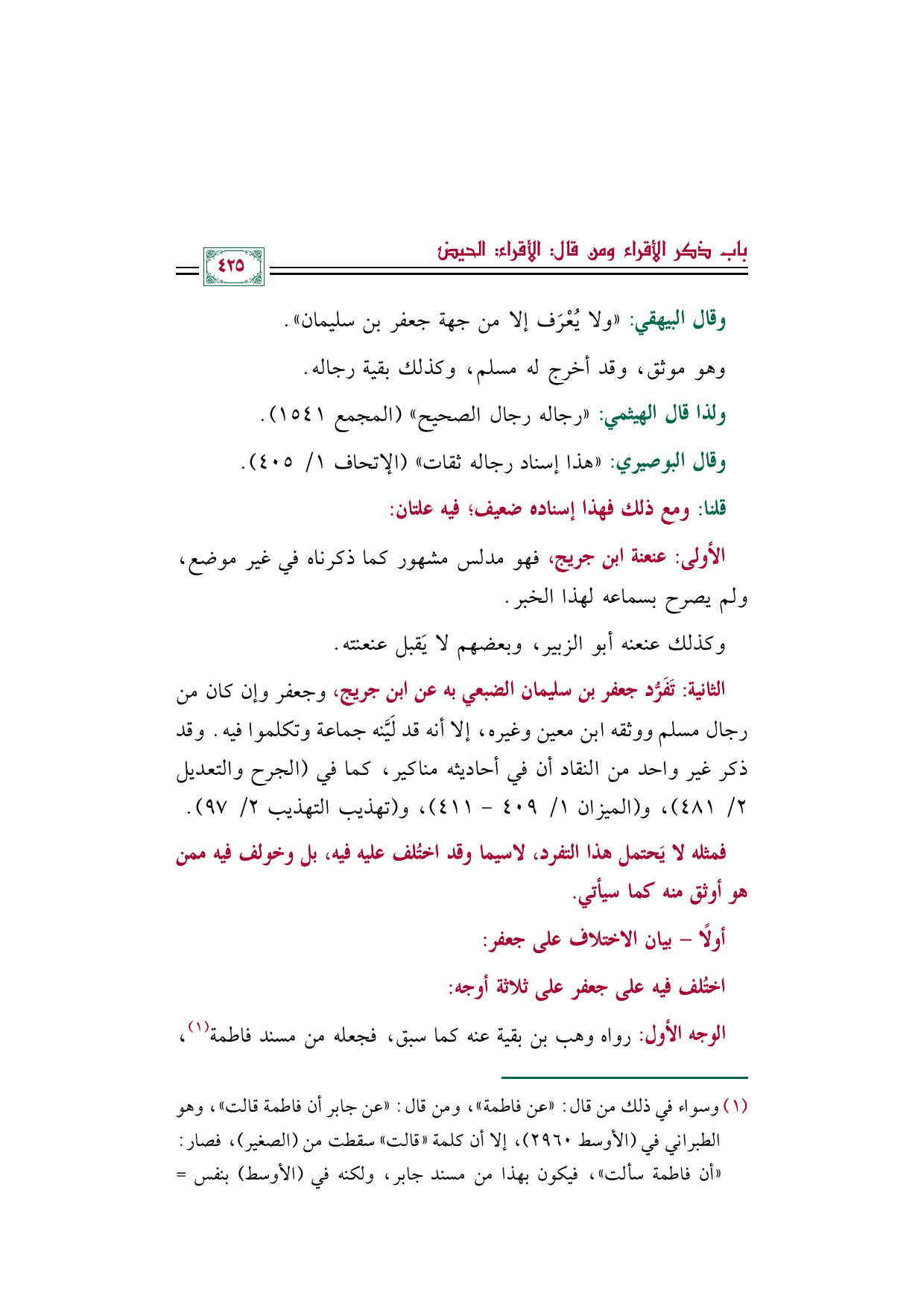 (¬١) - وسواء في ذلك من قال: ((عن فاطمة))، ومن قال: ((عن جابر أن فاطمة قالت))، وهو الطبراني في (الأوسط ٢٩٦٠)، إلا أن كلمة ((قالت)) سقطت من (الصغير)، فصار: ((أن فاطمة سألت))، فيكون بهذا من مسند جابر، ولكنه في (الأوسط) بنفس سند (الصغير)! فيُحمل على سقوطها من الناسخ. والله أعلم.