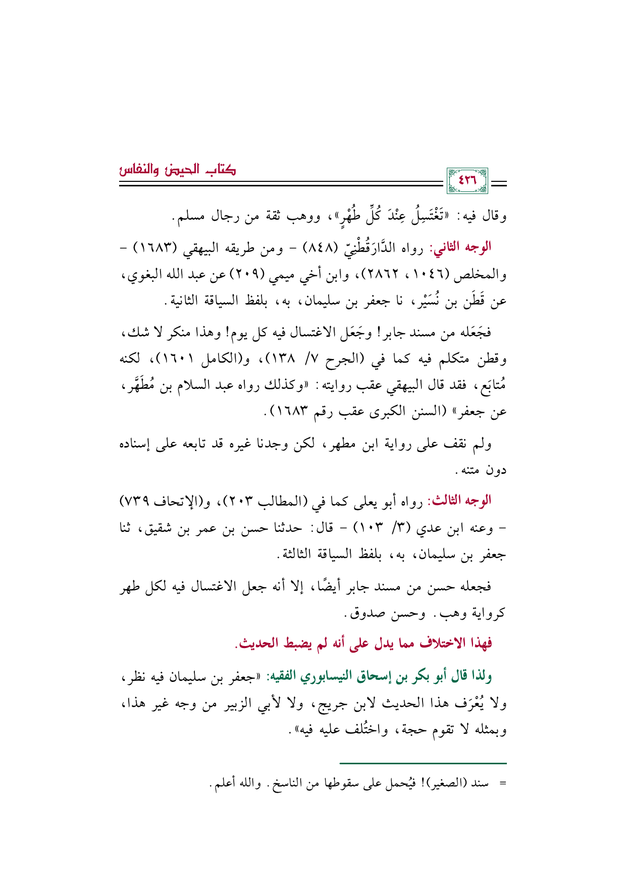 فجَعَله من مسند جابر! وجَعَل الاغتسال فيه كل يوم! وهذا منكر لا شك، وقطن متكلم فيه كما في (الجرح ٧/ ١٣٨)، و (الكامل ١٦٠١)، لكنه مُتابَع، فقد قال البيهقي عقب روايته: ((وكذلك رواه عبد السلام بن مُطَهَّر، عن جعفر)) (السنن الكبرى عقب رقم ١٦٨٣).