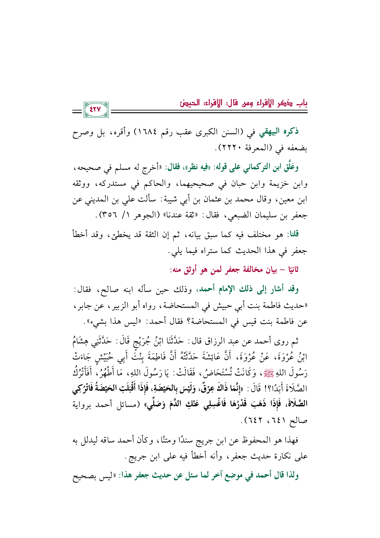 وقد أشار إلى ذلك الإمام أحمد، وذلك حين سأله ابنه صالح، فقال: ((حديث فاطمة بنت أبي حبيش في المستحاضة، رواه أبو الزبير، عن جابر، عن فاطمة بنت قيس في المستحاضة؟ فقال أحمد: ((ليس هذا بشيء)).