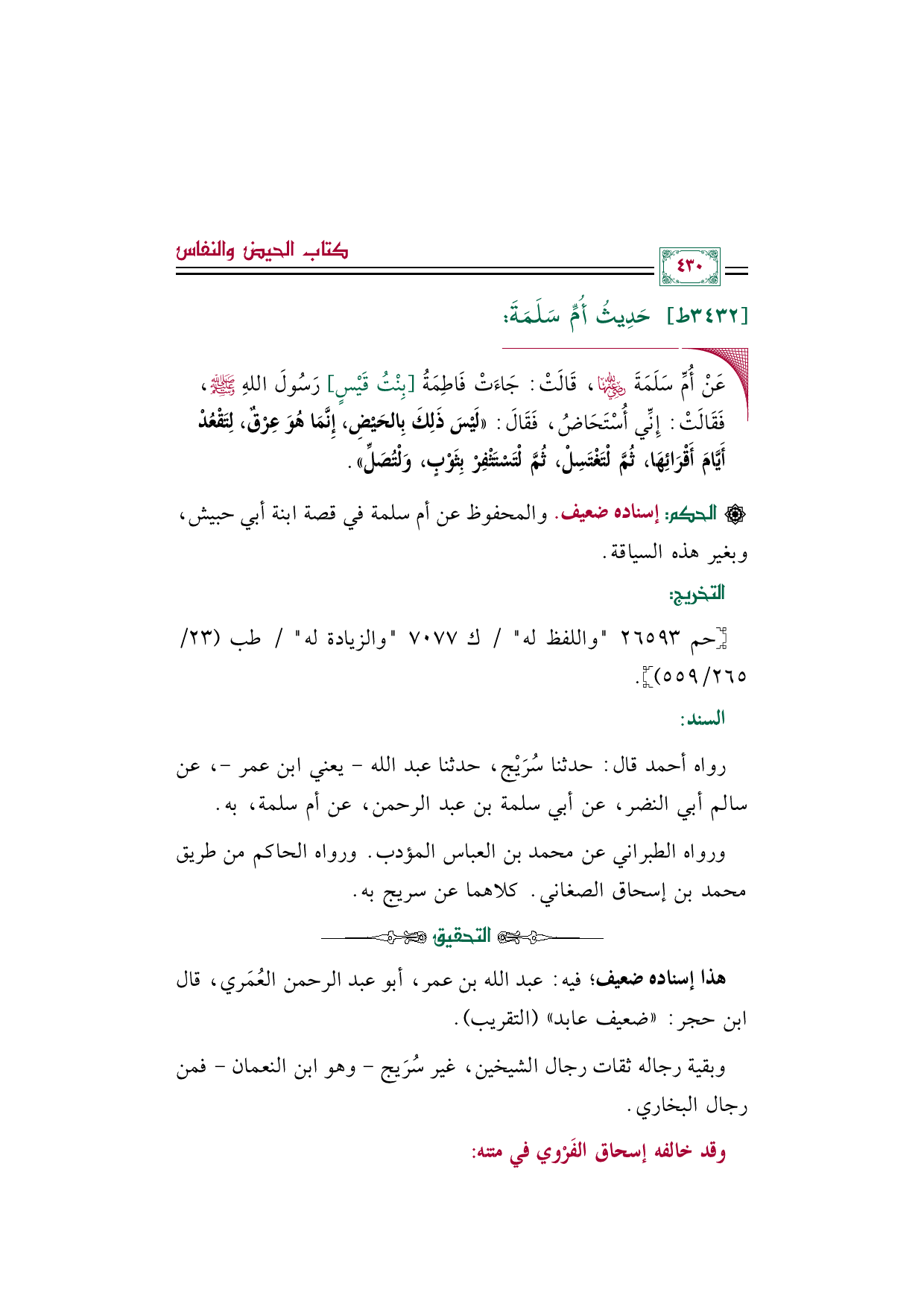 رواه أحمد قال: حدثنا سُرَيْج، حدثنا عبد الله- يعني ابن عمر-، عن سالم أبي النضر، عن أبي سلمة بن عبد الرحمن، عن أم سلمة، به.