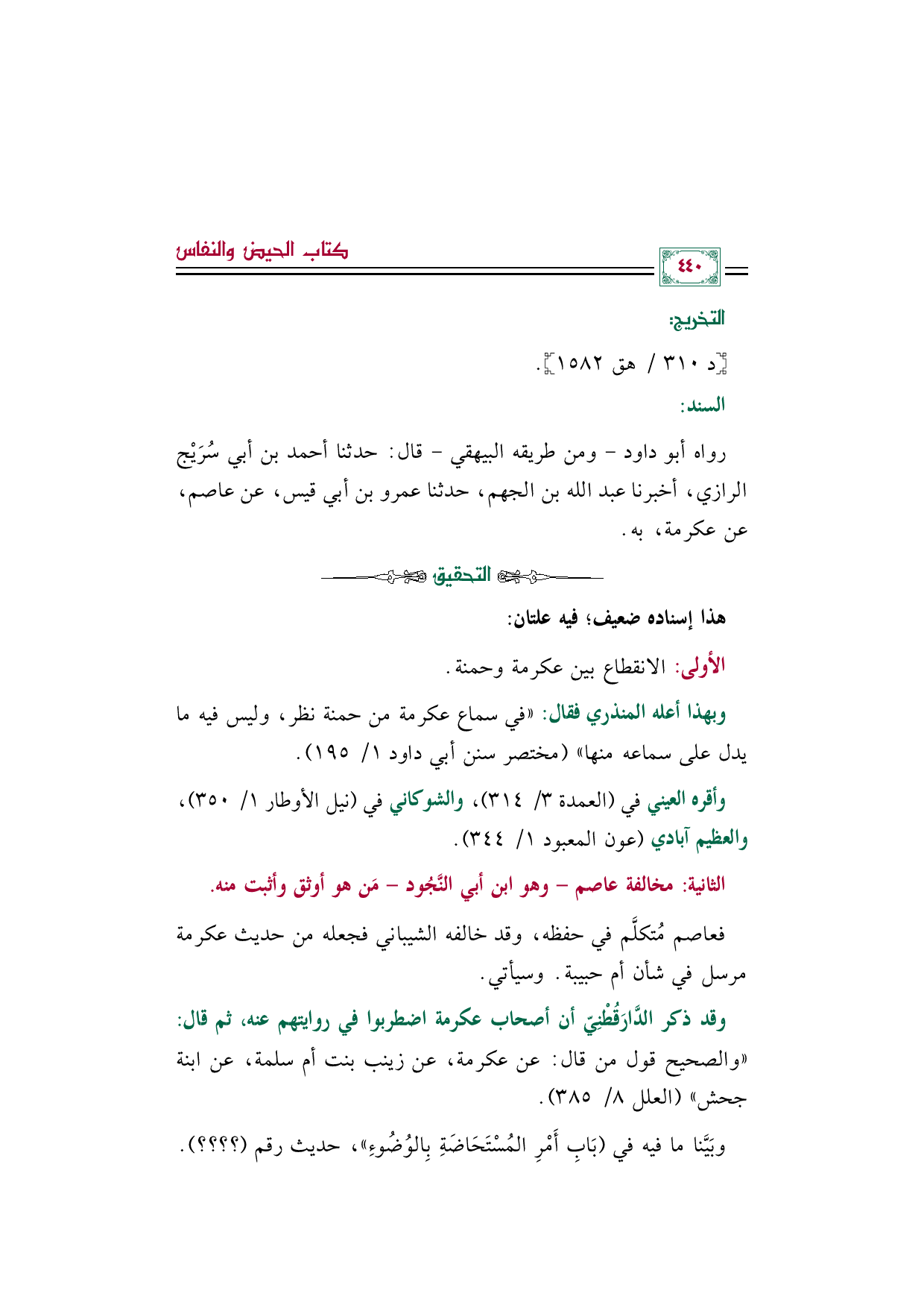 وبهذا أعله المنذري فقال: ((في سماع عكرمة من حمنة نظر، وليس فيه ما يدل على سماعه منها)) (مختصر سنن أبي داود ١/ ١٩٥).