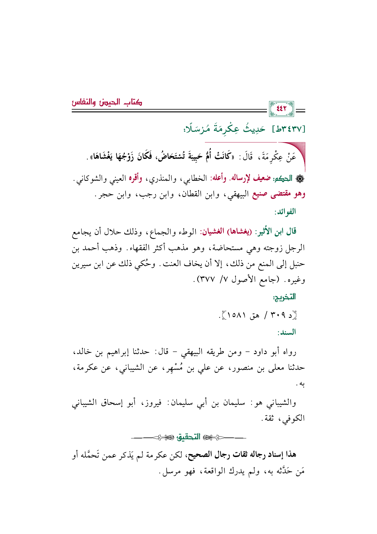 قال ابن الأثير: (يغشاها) الغشيان: الوطء والجماع، وذلك حلال أن يجامع الرجل زوجته وهي مستحاضة، وهو مذهب أكثر الفقهاء. وذهب أحمد بن حنبل إلى المنع من ذلك، إلا أن يخاف العنت. وحُكي ذلك عن ابن سيرين وغيره. (جامع الأصول ٧/ ٣٧٧).
