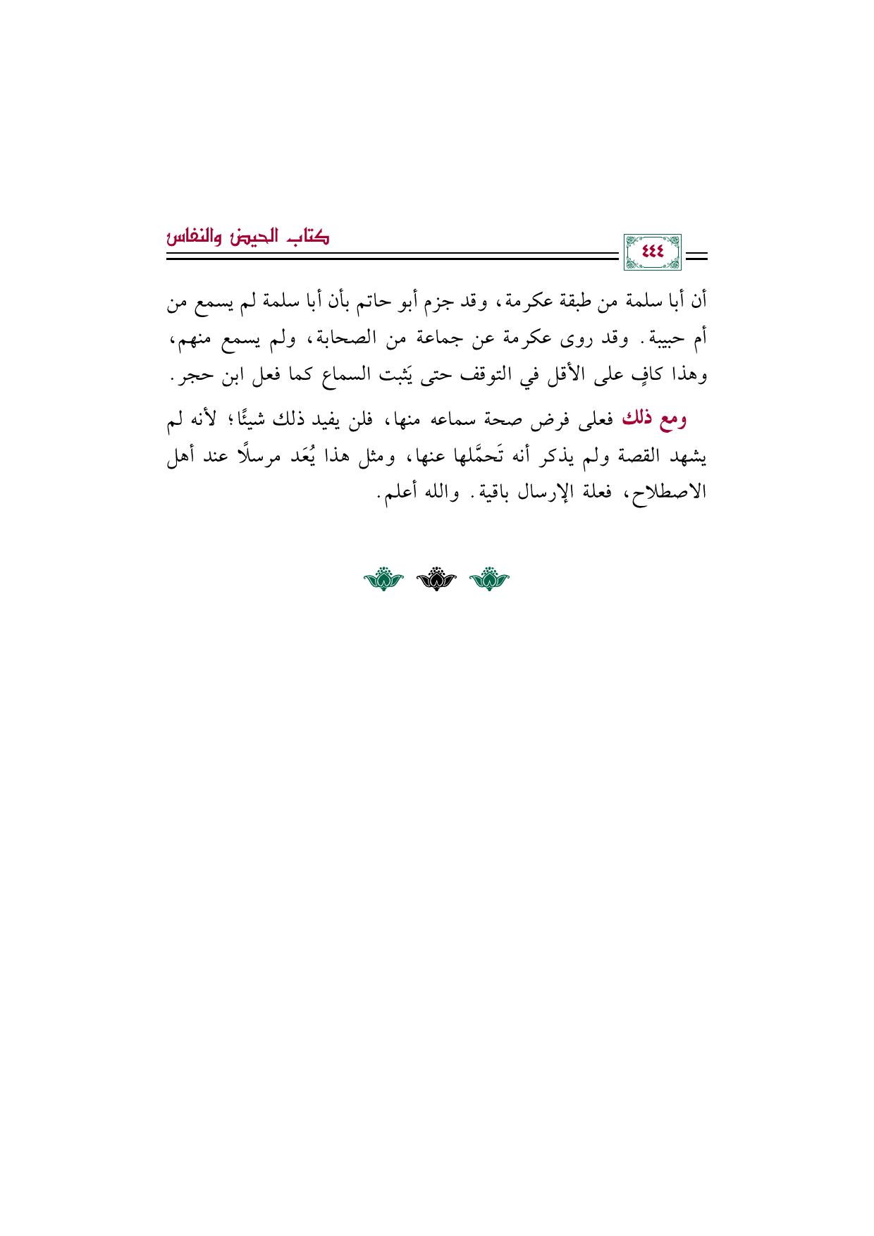 أن أبا سلمة من طبقة عكرمة، وقد جزم أبو حاتم بأن أبا سلمة لم يسمع من أم حبيبة. وقد روى عكرمة عن جماعة من الصحابة، ولم يسمع منهم، وهذا كافٍ على الأقل في التوقف حتى يَثبت السماع كما فعل ابن حجر.