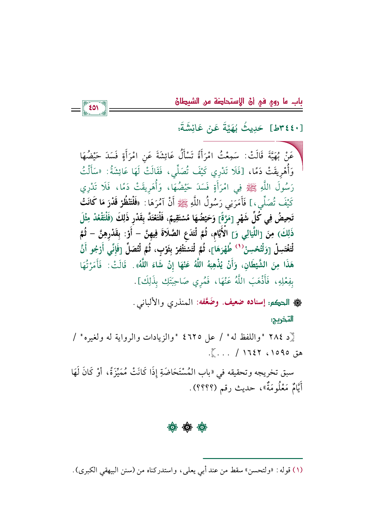 سبق تخريجه وتحقيقه في (باب المُسْتَحَاضَةِ إِذَا كَانَتْ مُمَيِّزَةً، أوْ كَانَ لَهَا أَيَّامٌ مَعْلُومَةٌ)، حديث رقم (؟ ؟ ؟ ؟ ).