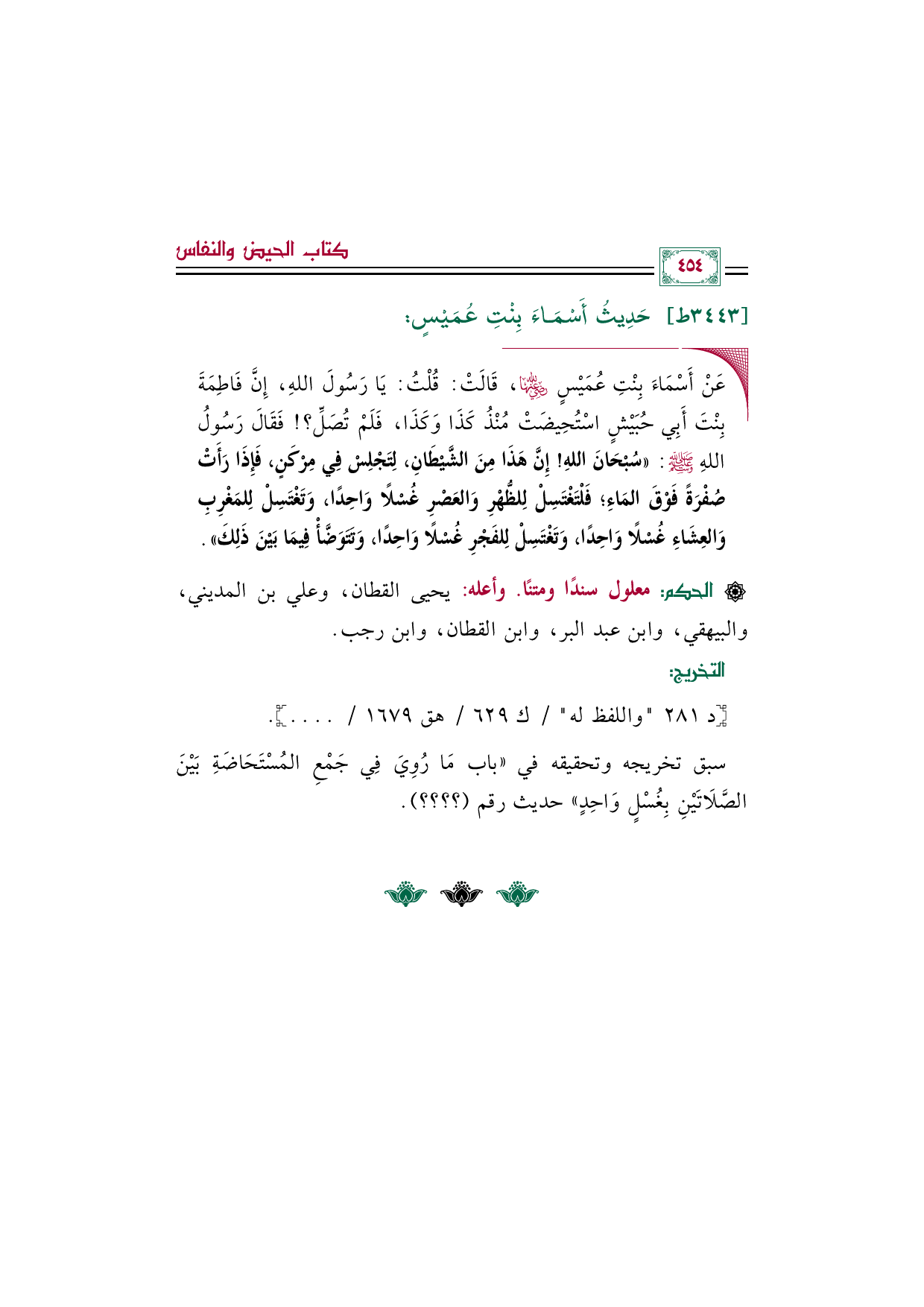 ◼ عَنْ أَسْمَاءَ بِنْتِ عُمَيْسٍ رَضِيَ اللهُ عَنْهَا، قَالَتْ: قُلْتُ: يَا رَسُولَ اللهِ، إِنَّ فَاطِمَةَ بِنْتَ أَبِي حُبَيْشٍ اسْتُحِيضَتْ مُنْذُ كَذَا وَكَذَا، فَلَمْ تُصَلِّ؟ ! فَقَالَ رَسُولُ اللهِ صَلَّى اللهُ عَلَيْهِ وَسَلَّمَ: ((سُبْحَانَ اللهِ! إِنَّ هَذَا مِنَ الشَّيْطَانِ، لِتَجْلِسْ فِي مِرْكَنٍ، فَإِذَا رَأَتْ صُفْرَةً فَوْقَ المَاءِ؛ فَلْتَغْتَسِلْ لِلظُّهْرِ وَالعَصْرِ غُسْلًا وَاحِدًا، وَتَغْتَسِلْ لِلمَغْرِبِ وَالعِشَاءِ غُسْلًا وَاحِدًا، وَتَغْتَسِلْ لِلفَجْرِ غُسْلًا وَاحِدًا، وَتَتَوَضَّأْ فِيمَا بَيْنَ ذَلِكَ)).