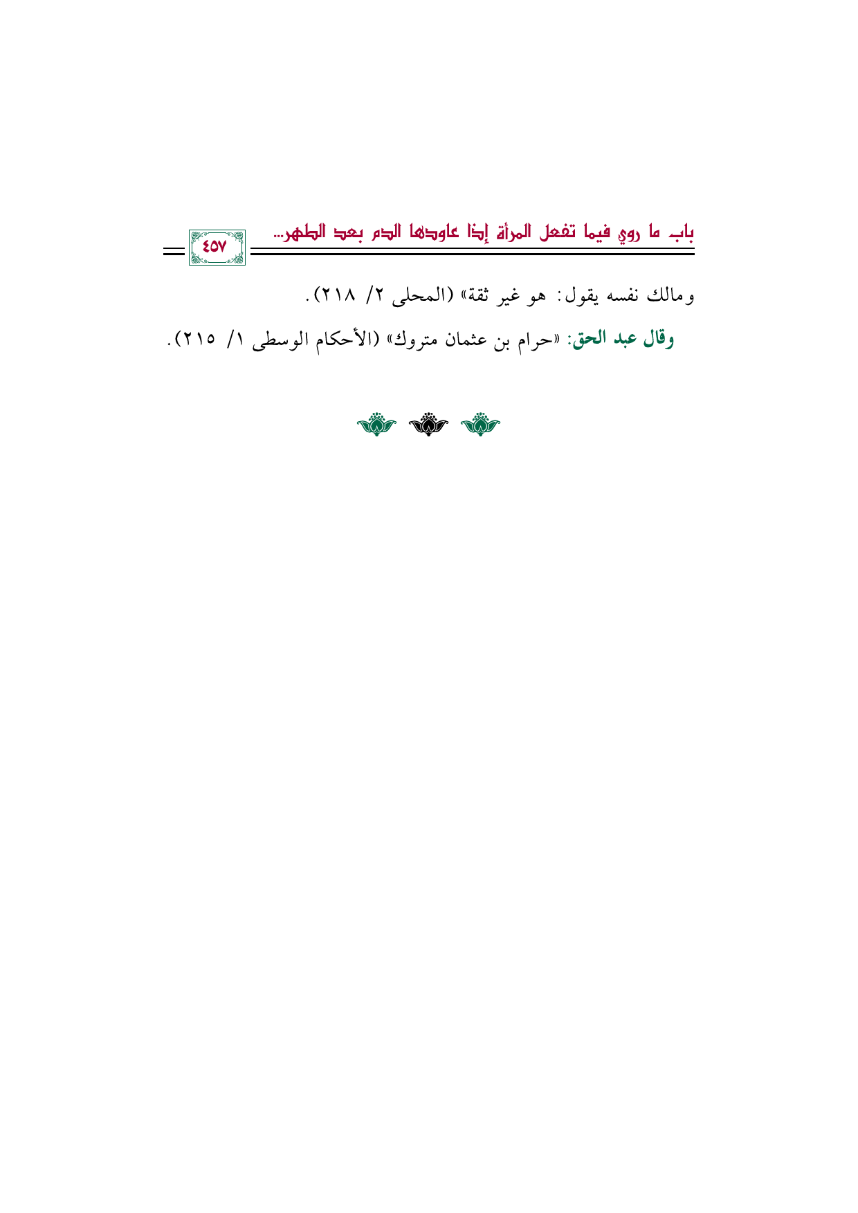وقال عبد الحق: ((حرام بن عثمان متروك)) (الأحكام الوسطى ١/ ٢١٥).