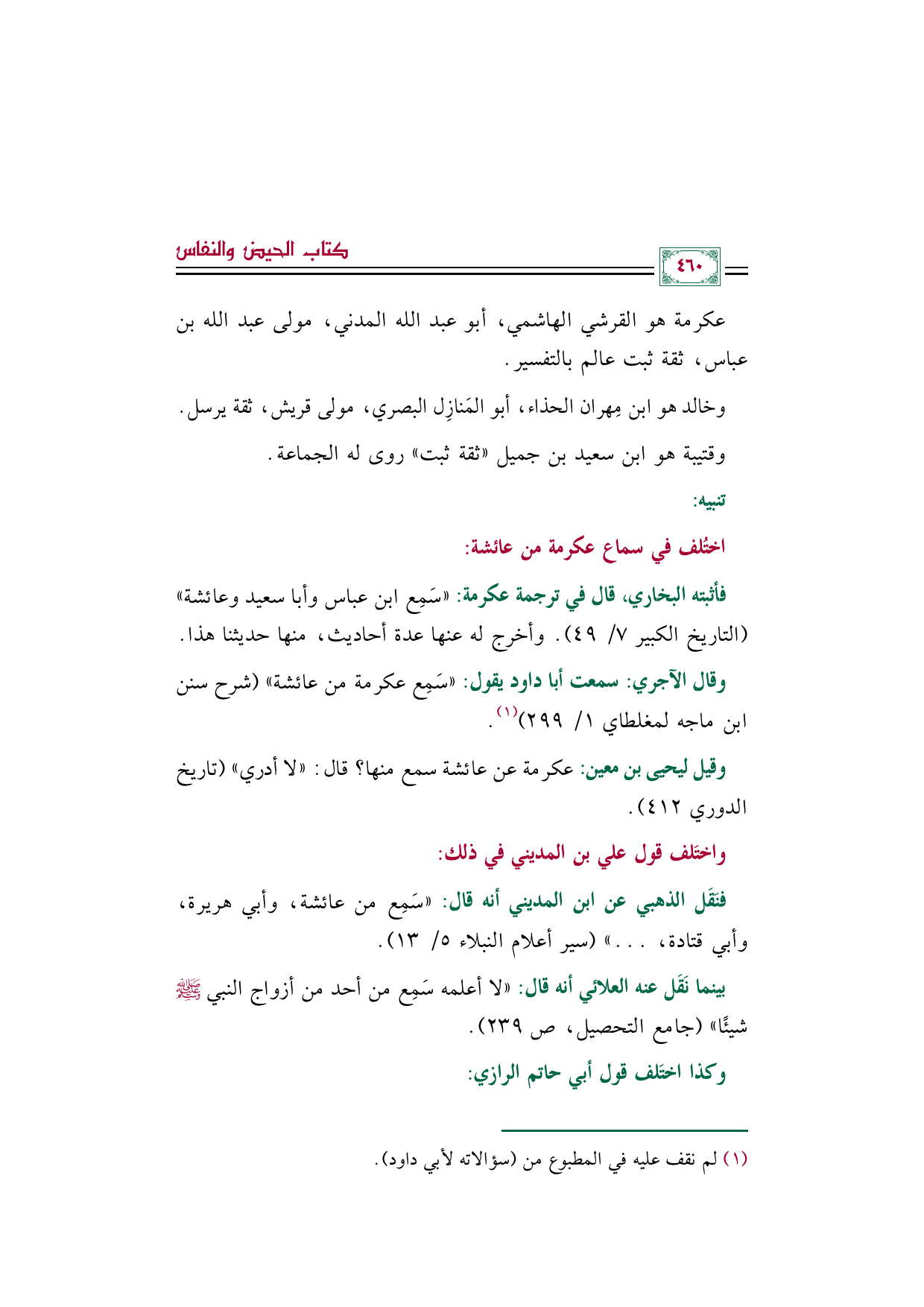 وقال الآجري: سمعت أبا داود يقول: "سَمِع عكرمة من عائشة" (شرح سنن ابن ماجه لمغلطاي ١/ ٢٩٩) (¬١).