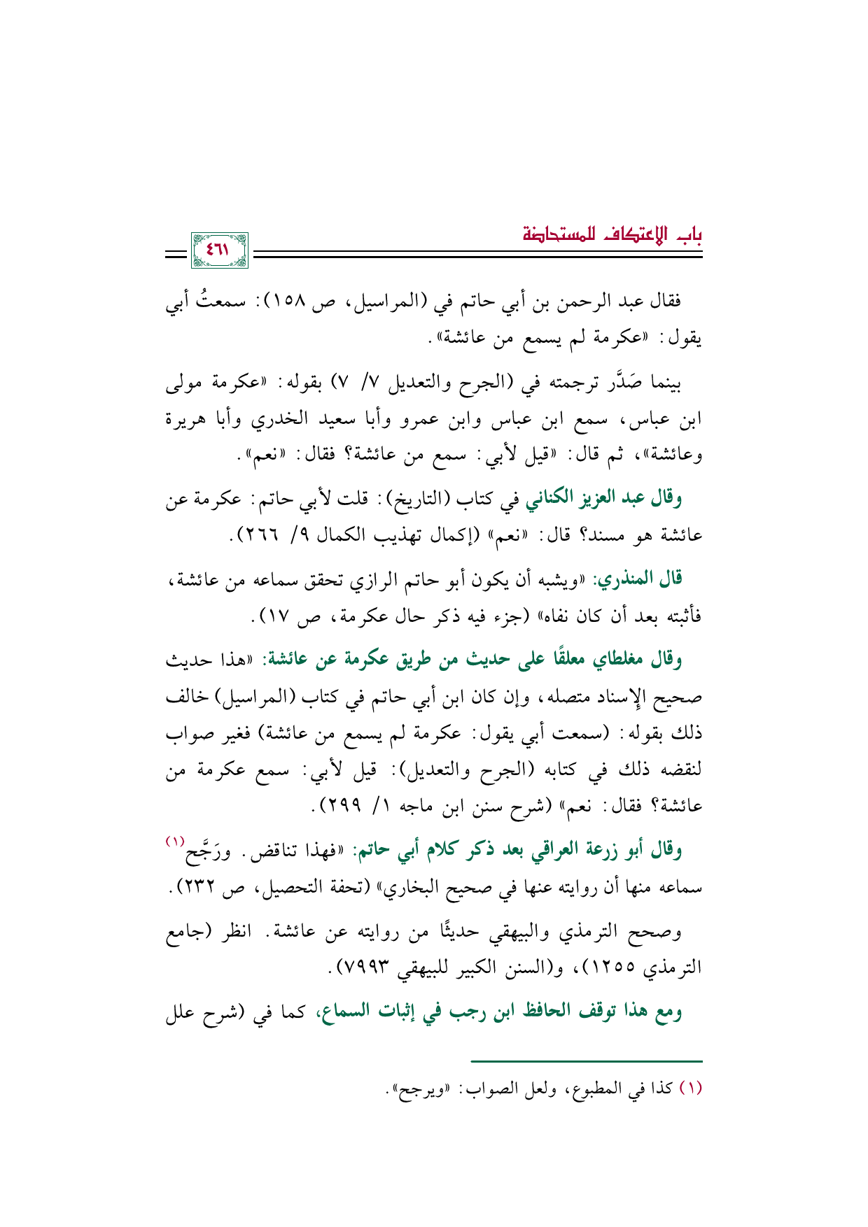 وقال مغلطاي معلقًا على حديث من طريق عكرمة عن عائشة: "هذا حديث صحيح الإِسناد متصله، وإن كان ابن أبي حاتم في كتاب (المراسيل) خالف ذلك بقوله: (سمعت أبي يقول: عكرمة لم يسمع من عائشة) فغير صواب لنقضه ذلك في كتابه (الجرح والتعديل): قيل لأبي: سمع عكرمة من عائشة؟ فقال: نعم" (شرح سنن ابن ماجه ١/ ٢٩٩).