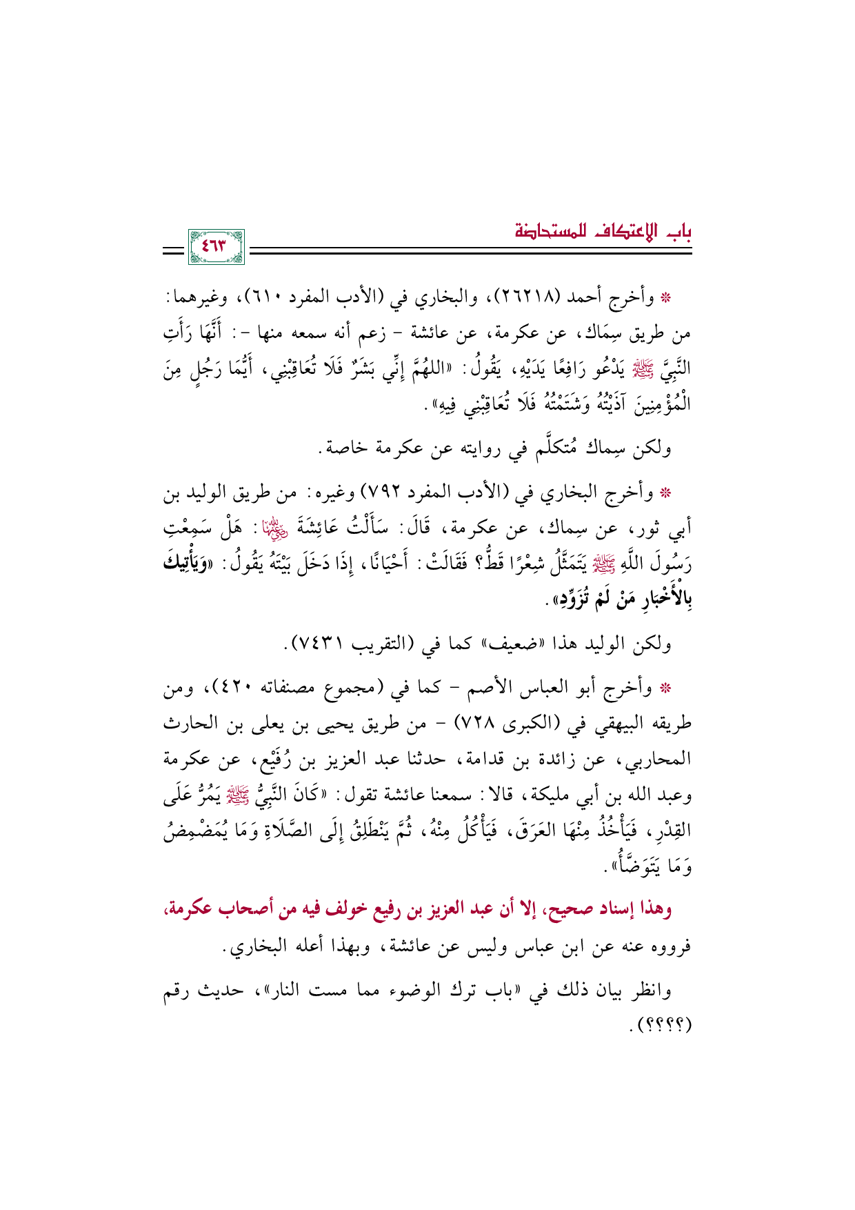 * وأخرج أحمد (٢٦٢١٨)، والبخاري في (الأدب المفرد ٦١٠)، وغيرهما: من طريق سِمَاك، عن عكرمة، عن عائشة - زعم أنه سمعه منها -: أَنَّهَا رَأَتِ النَّبِيَّ صَلَّى اللهُ عَلَيْهِ وَسَلَّمَ يَدْعُو رَافِعًا يَدَيْهِ، يَقُولُ: ((اللهُمَّ إِنِّي بَشَرٌ فَلَا تُعَاقِبْنِي، أَيُّمَا رَجُلٍ مِنَ الْمُؤْمِنِينَ آذَيْتُهُ وَشَتَمْتُهُ فَلَا تُعَاقِبْنِي فِيهِ)).