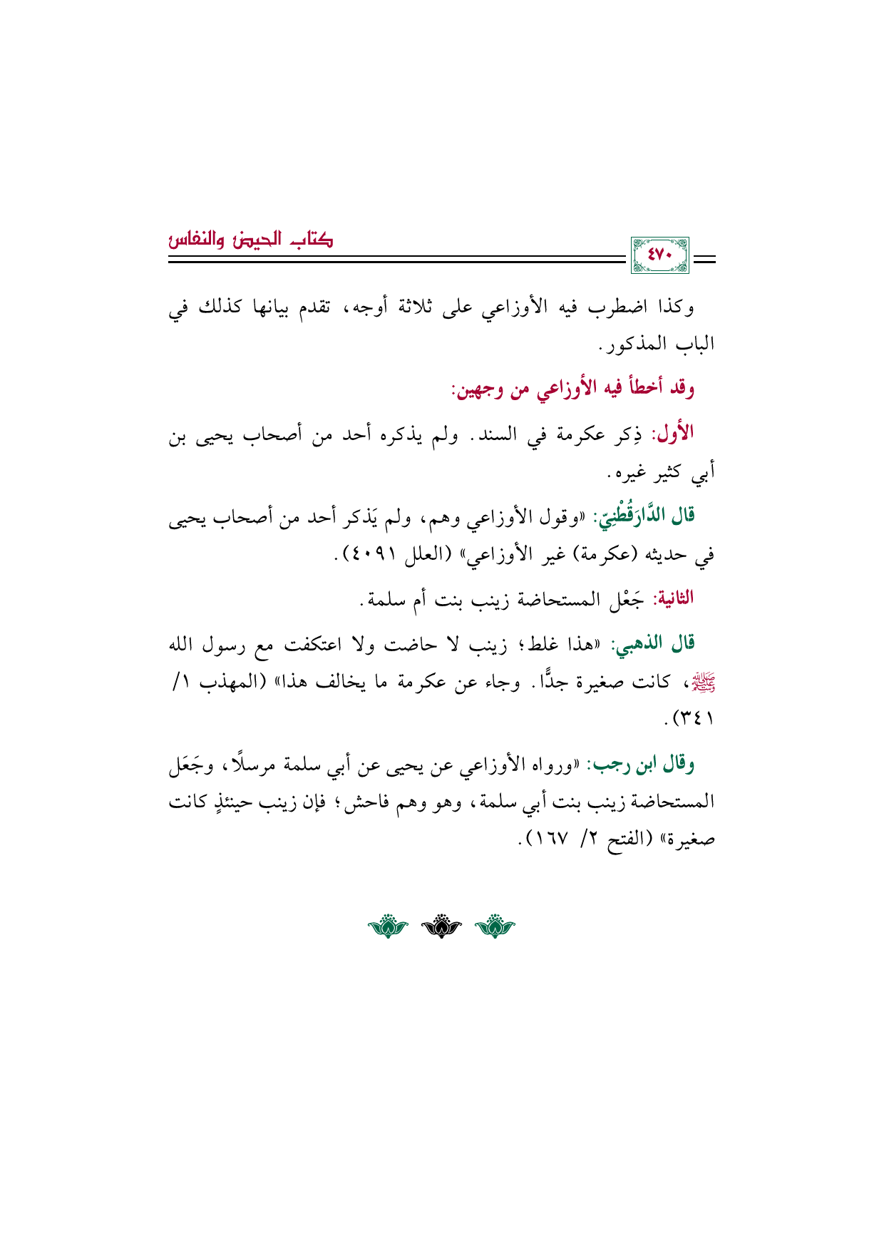 وقال ابن رجب: ((ورواه الأوزاعي عن يحيى عن أبي سلمة مرسلًا، وجَعَل المستحاضة زينب بنت أبي سلمة، وهو وهم فاحش؛ فإن زينب حينئذٍ كانت صغيرة)) (الفتح ٢/ ١٦٧).