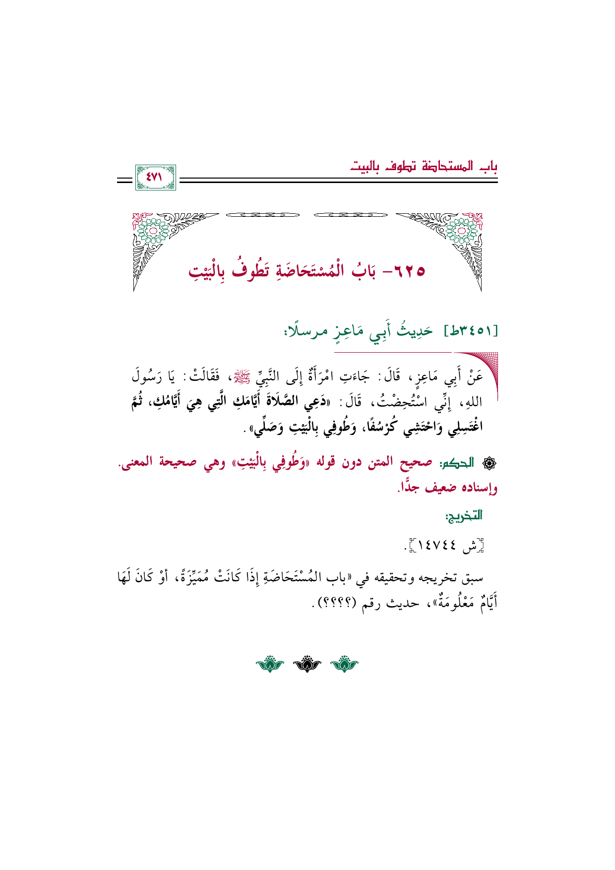◼ عَنْ أَبِي مَاعِزٍ، قَالَ: جَاءَتِ امْرَأَةٌ إِلَى النَّبِيِّ صَلَّى الله عَلَيْهِ وَسَلَّمَ، فَقَالَتْ: يَا رَسُولَ اللهِ، إِنِّي اسْتُحِضْتُ، قَالَ: ((دَعِي الصَّلَاةَ أَيَّامَكِ الَّتِي هِيَ أَيَّامُكِ، ثُمَّ اغْتَسِلِي وَاحْتَشِي كُرْسُفًا، وَطُوفِي بِالْبَيْتِ وَصَلِّي)).