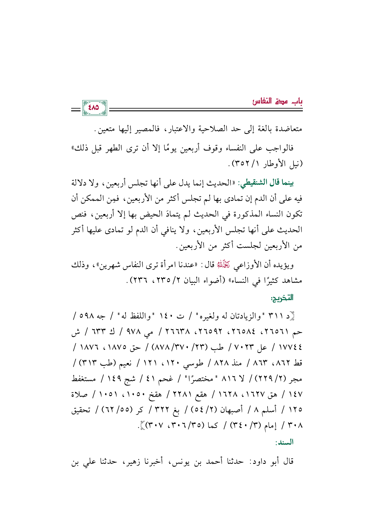 بينما قال الشنقيطي: ((الحديث إنما يدل على أنها تجلس أربعين، ولا دلالة فيه على أن الدم إن تمادى بها لم تجلس أكثر من الأربعين، فمِن الممكن أن تكون النساء المذكورة في الحديث لم يتمادَ الحيض بها إلا أربعين، فنص الحديث على أنها تجلس الأربعين، ولا ينافي أن الدم لو تمادى عليها أكثر من الأربعين لجلست أكثر من الأربعين.