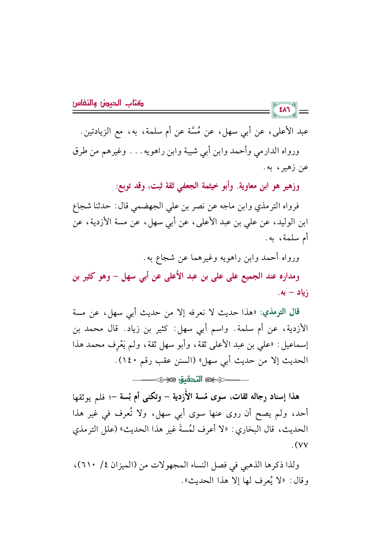 قال الترمذي: ((هذا حديث لا نعرفه إلا من حديث أبي سهل، عن مسة الأزدية، عن أم سلمة. واسم أبي سهل: كثير بن زياد. قال محمد بن إسماعيل: ((علي بن عبد الأعلى ثقة، وأبو سهل ثقة، ولم يَعْرِف محمد هذا الحديث إلا من حديث أبي سهل)) (السنن عقب رقم ١٤٠).