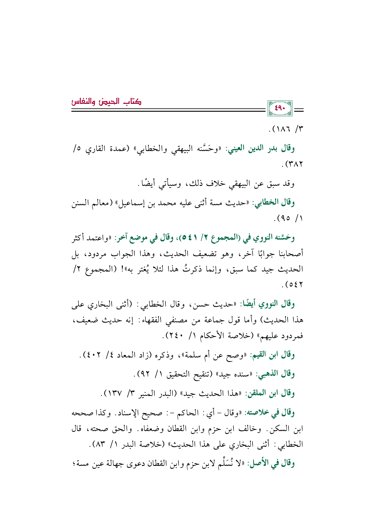 وقال بدر الدين العيني: ((وحَسَّنه البيهقي والخطابي)) (عمدة القاري ٥/ ٣٨٢).