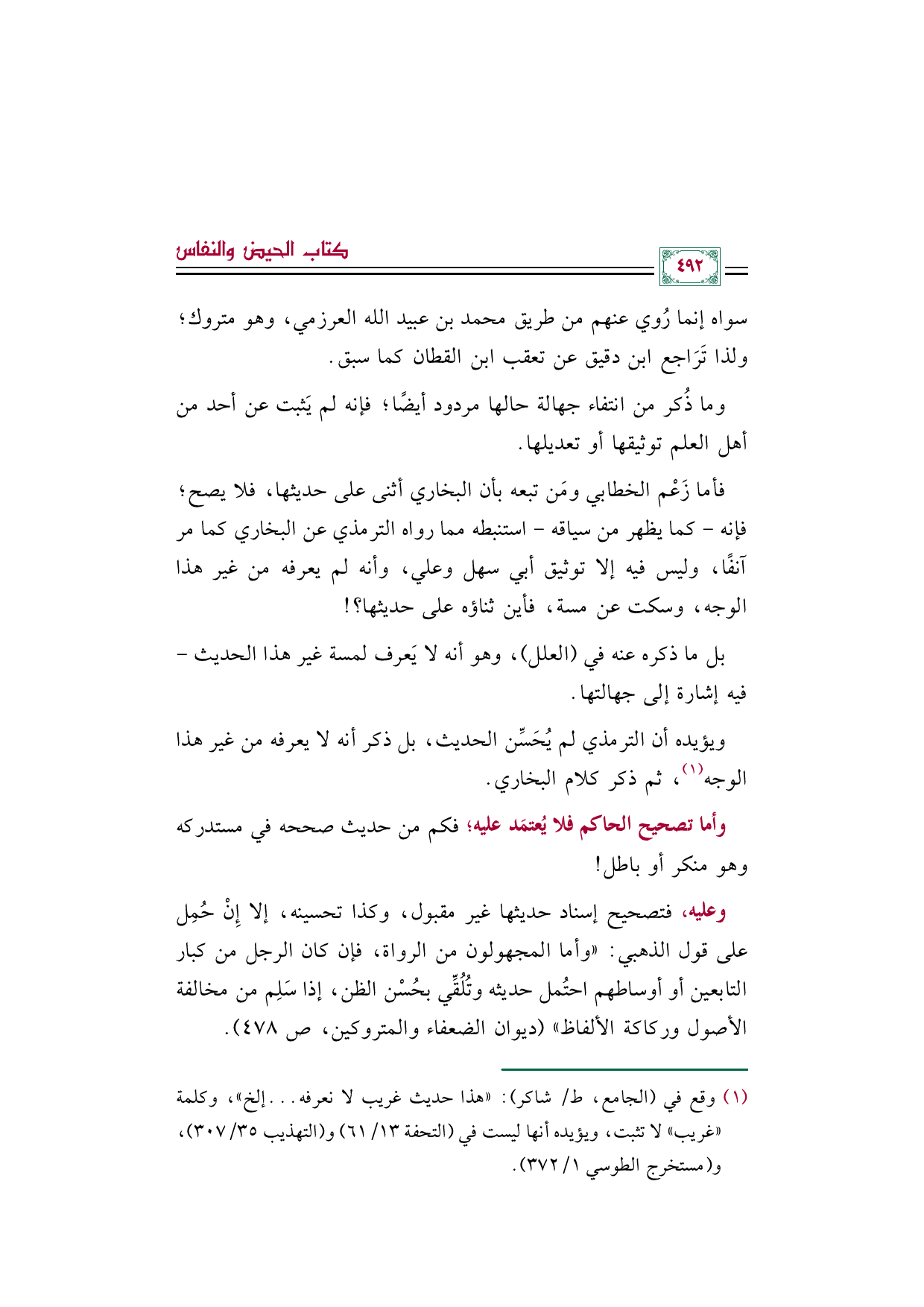 ويؤيده أن الترمذي لم يُحَسِّن الحديث، بل ذكر أنه لا يعرفه من غير هذا الوجه (¬١)، ثم ذكر كلام البخاري.