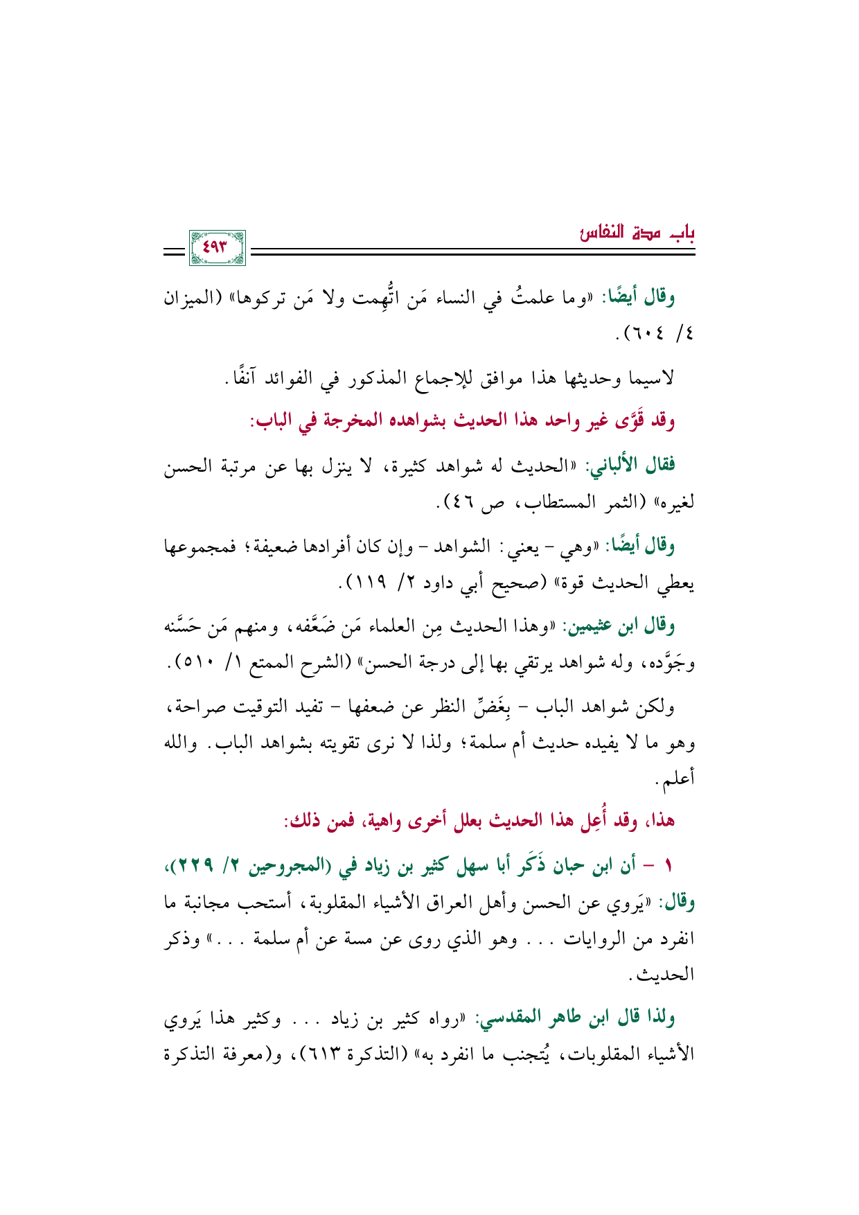 ولكن شواهد الباب -بِغَضِّ النظر عن ضعفها- تفيد التوقيت صراحة، وهو ما لا يفيده حديث أم سلمة؛ ولذا لا نرى تقويته بشواهد الباب. والله أعلم.