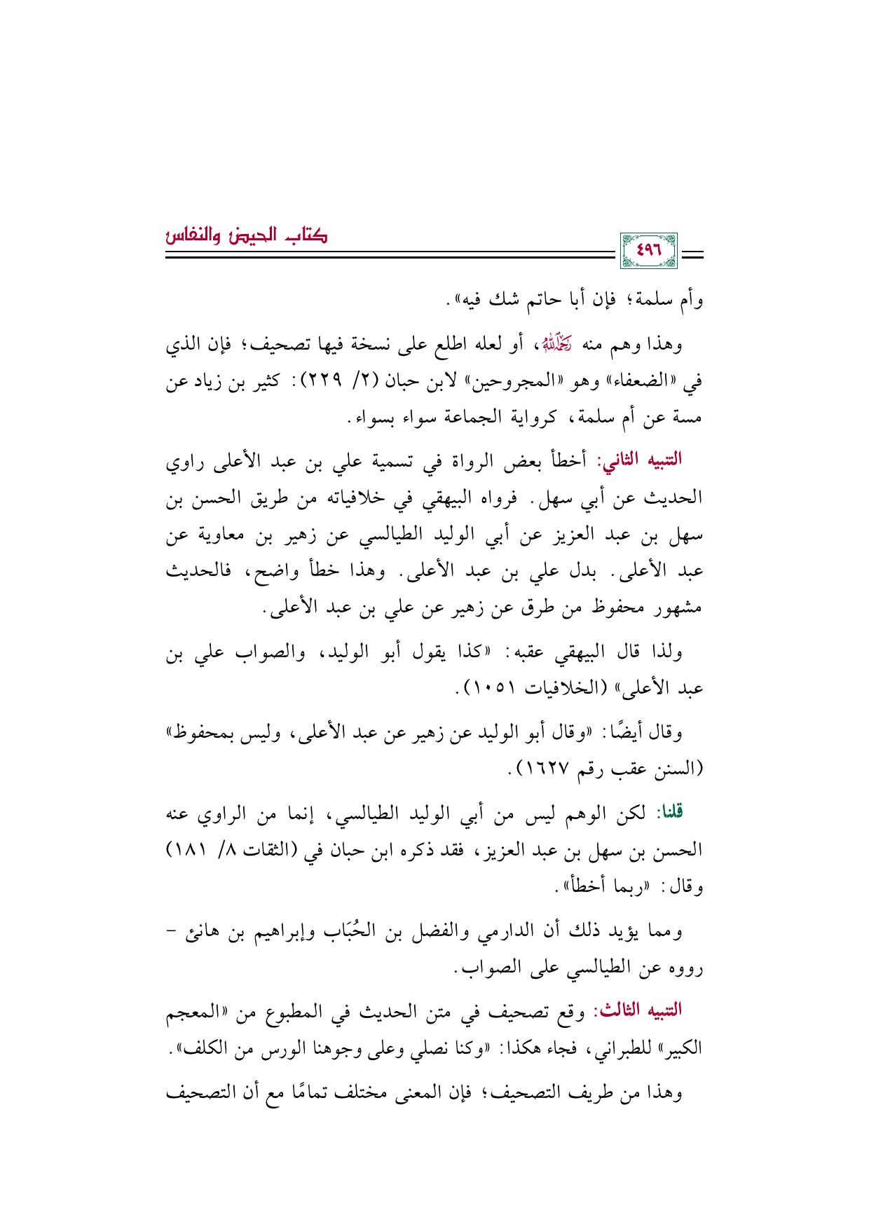 التنبيه الثاني: أخطأ بعض الرواة في تسمية علي بن عبد الأعلى راوي الحديث عن أبي سهل. فرواه البيهقي في خلافياته من طريق الحسن بن سهل بن عبد العزيز عن أبي الوليد الطيالسي عن زهير بن معاوية عن عبد الأعلى. بدل علي بن عبد الأعلى. وهذا خطأ واضح، فالحديث مشهور محفوظ من طرق عن زهير عن علي بن عبد الأعلى.