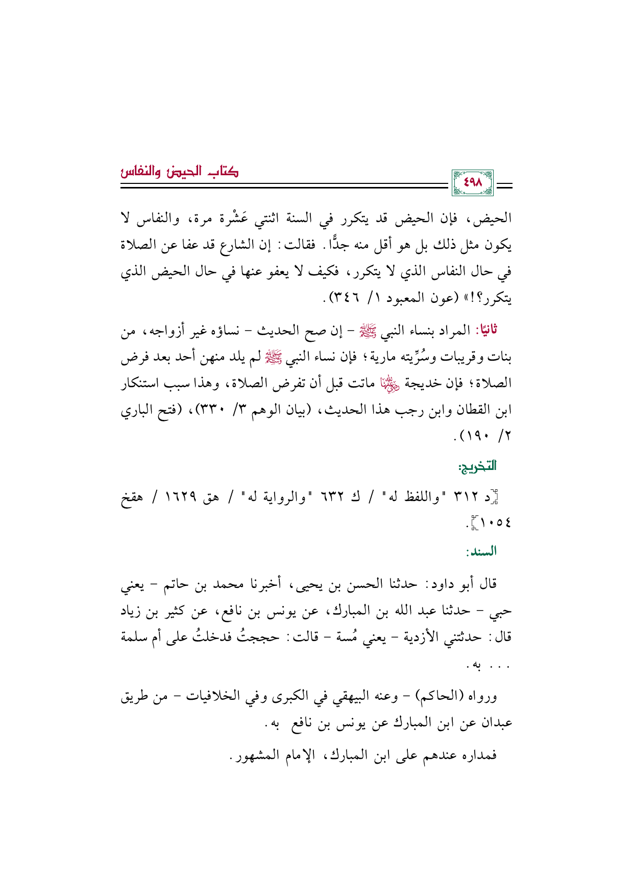 الحيض، فإن الحيض قد يتكرر في السنة اثنتي عَشْرة مرة، والنفاس لا يكون مثل ذلك بل هو أقل منه جدًّا. فقالت: إن الشارع قد عفا عن الصلاة في حال النفاس الذي لا يتكرر، فكيف لا يعفو عنها في حال الحيض الذي يتكرر؟ ! )) (عون المعبود ١/ ٣٤٦).