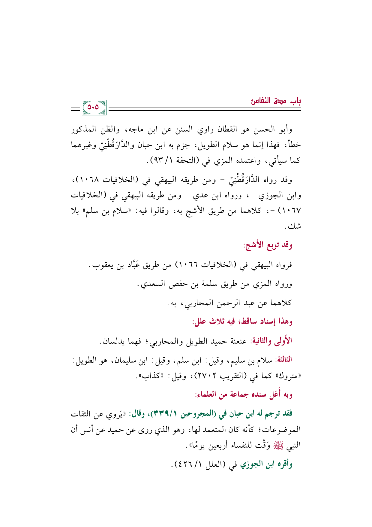 وأبو الحسن هو القطان راوي السنن عن ابن ماجه، والظن المذكور خطأ، فهذا إنما هو سلام الطويل، جزم به ابن حبان والدَّارَقُطْنِيّ وغيرهما كما سيأتي، واعتمده المزي في (التحفة ١/ ٩٣).
