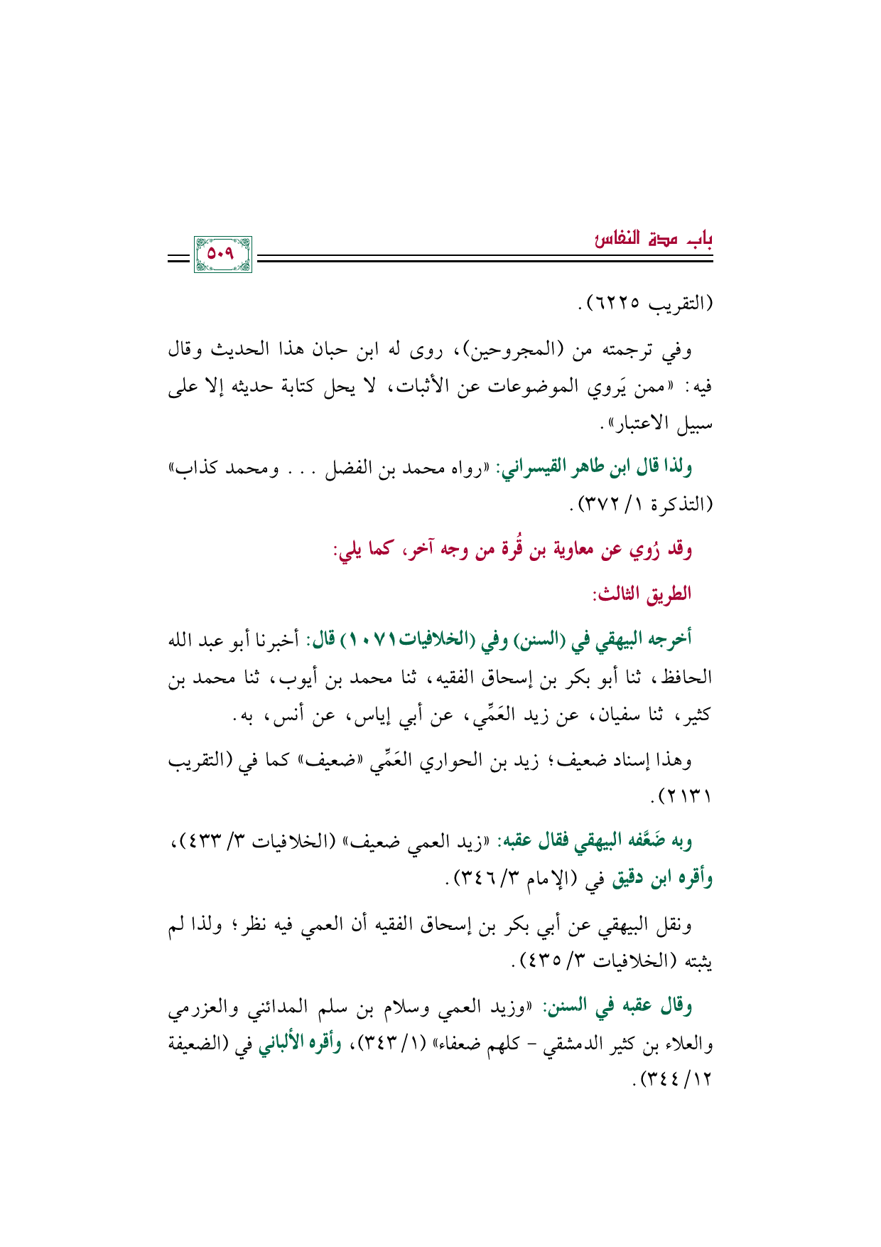 وقال عقبه في السنن: ((وزيد العمي وسلام بن سلم المدائني والعزرمي والعلاء بن كثير الدمشقي- كلهم ضعفاء)) (١/ ٣٤٣)، وأقره الألباني في (الضعيفة ١٢/ ٣٤٤).