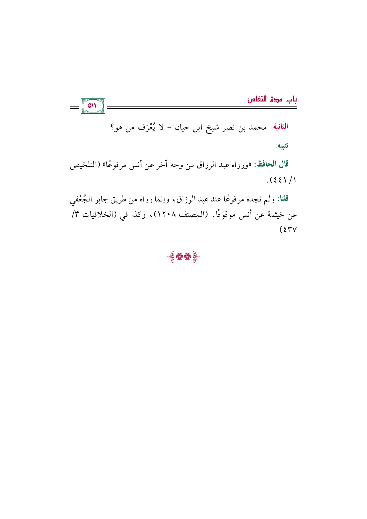 قلنا: ولم نجده مرفوعًا عند عبد الرزاق، وإنما رواه من طريق جابر الجُعْفي عن خيثمة عن أنس موقوفًا. (المصنف ١٢٠٨)، وكذا في (الخلافيات ٣/ ٤٣٧).