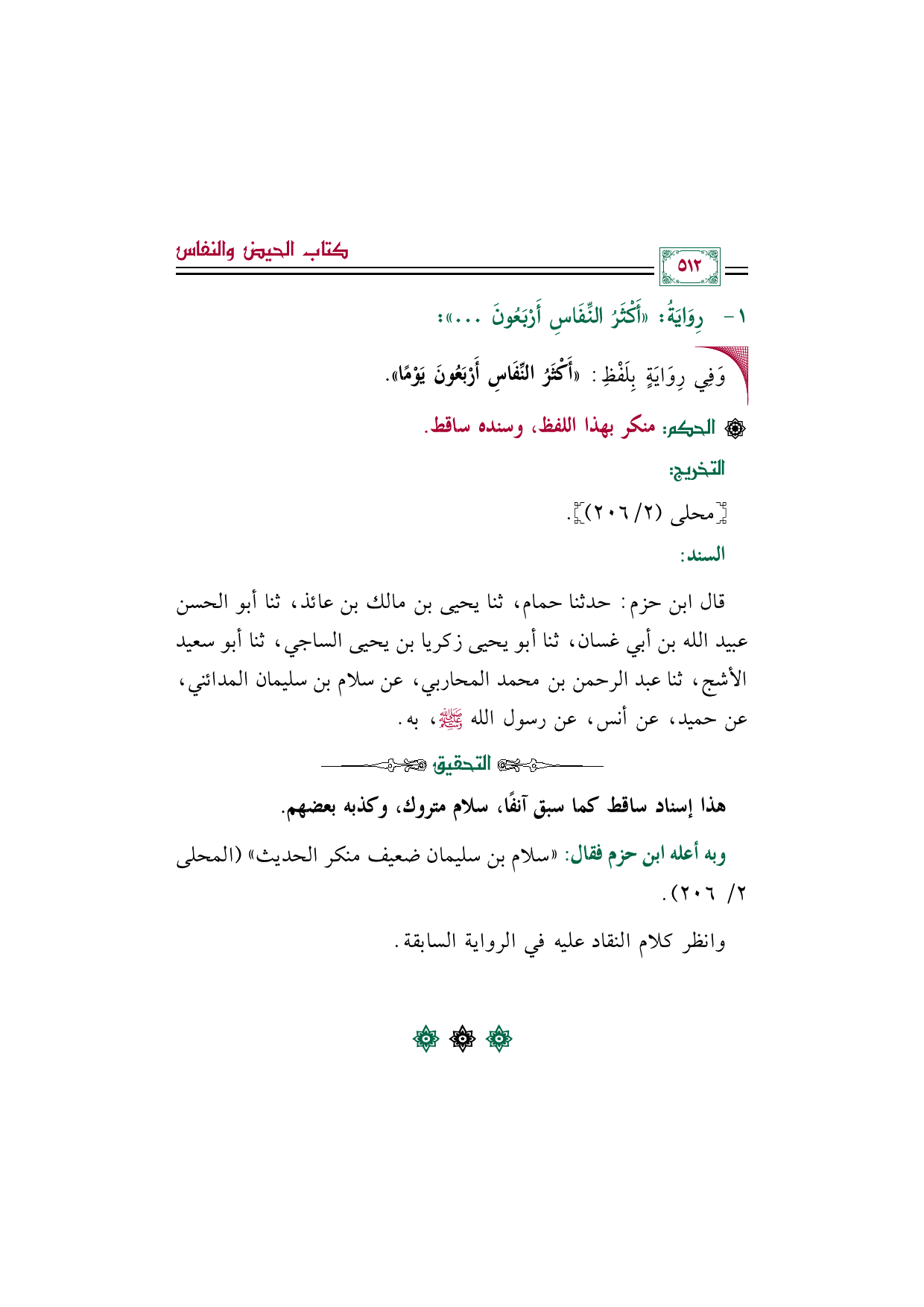 قال ابن حزم: حدثنا حمام، ثنا يحيى بن مالك بن عائذ، ثنا أبو الحسن عبيد الله بن أبي غسان، ثنا أبو يحيى زكريا بن يحيى الساجي، ثنا أبو سعيد الأشج، ثنا عبد الرحمن بن محمد المحاربي، عن سلام بن سليمان المدائني، عن حميد، عن أنس، عن رسول الله صلى الله عليه وسلم، به.
