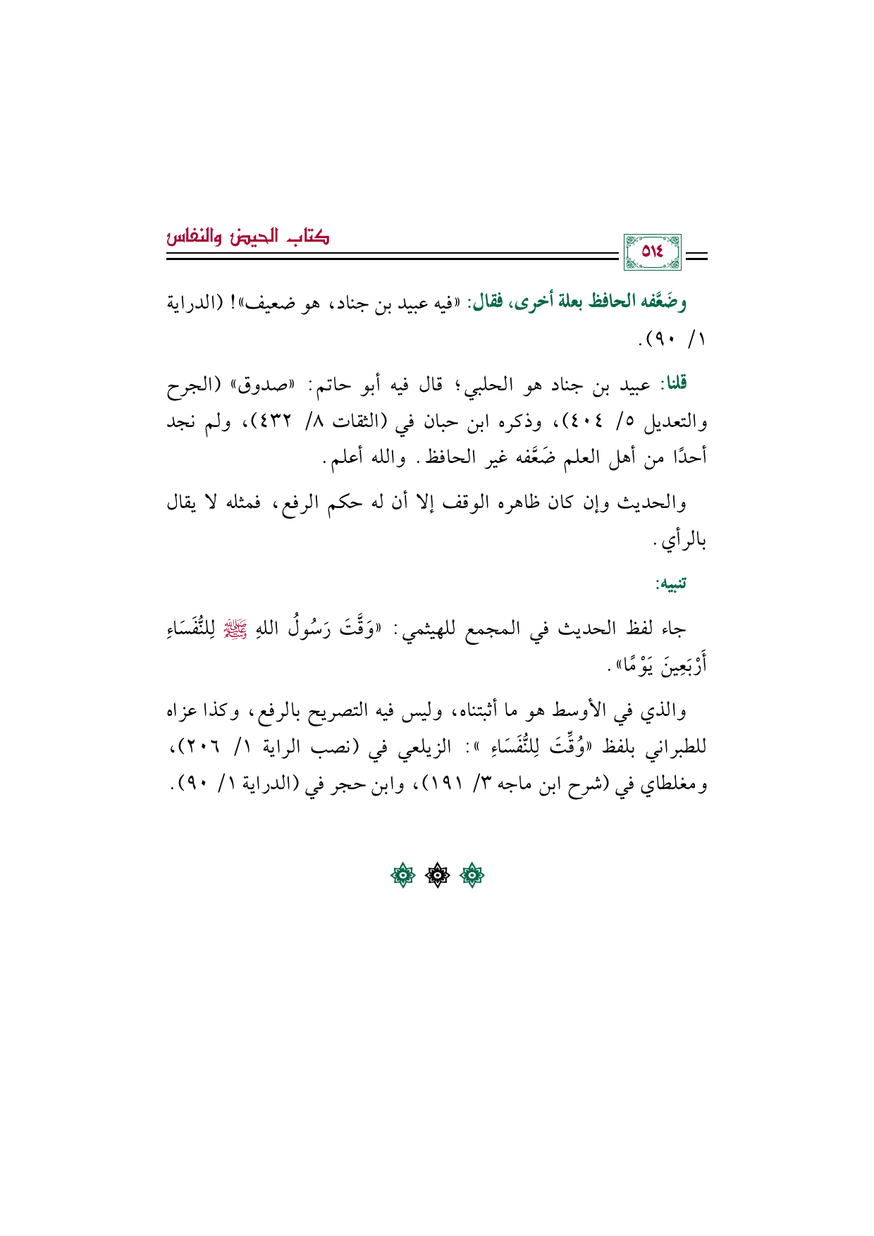 والذي في الأوسط هو ما أثبتناه، وليس فيه التصريح بالرفع، وكذا عزاه للطبراني بلفظ ((وُقِّتَ لِلنُّفَسَاءِ ... )): الزيلعي في (نصب الراية ١/ ٢٠٦)، ومغلطاي في (شرح ابن ماجه ٣/ ١٩١)، وابن حجر في (الدراية ١/ ٩٠).