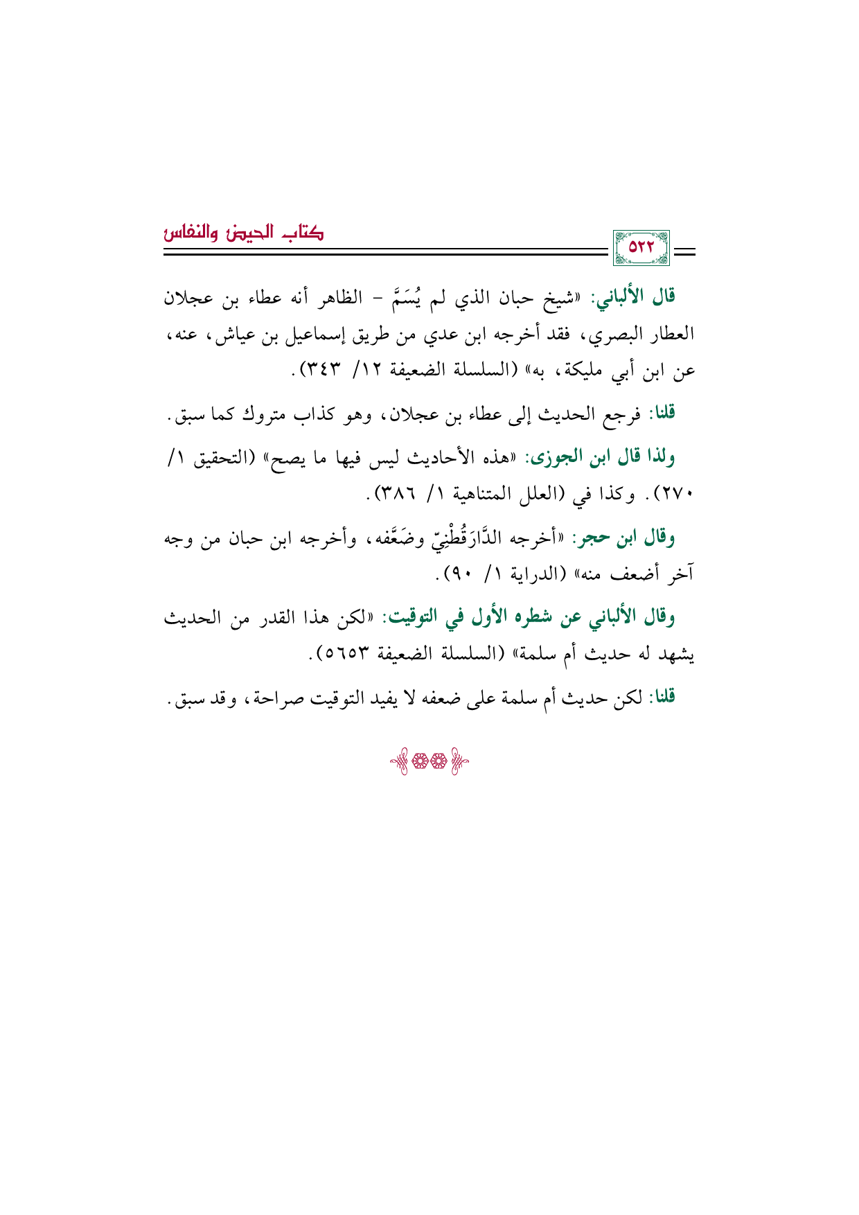 ولذا قال ابن الجوزى: ((هذه الأحاديث ليس فيها ما يصح)) (التحقيق ١/ ٢٧٠). وكذا في (العلل المتناهية ١/ ٣٨٦).