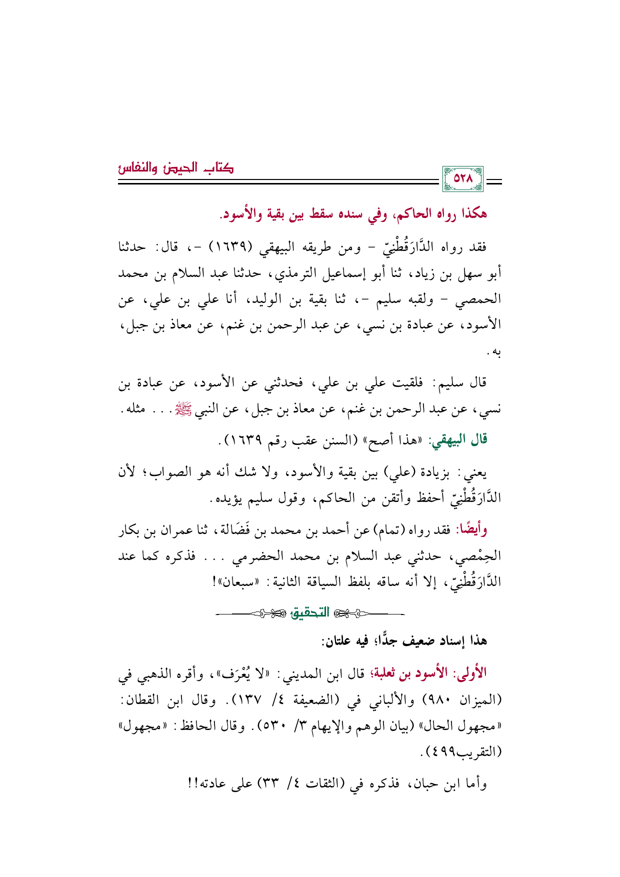 فقد رواه الدَّارَقُطْنِيّ - ومن طريقه البيهقي (١٦٣٩) -، قال: حدثنا أبو سهل بن زياد، ثنا أبو إسماعيل الترمذي، حدثنا عبد السلام بن محمد الحمصي- ولقبه سليم-، ثنا بقية بن الوليد، أنا علي بن علي، عن الأسود، عن عبادة بن نسي، عن عبد الرحمن بن غنم، عن معاذ بن جبل، به.