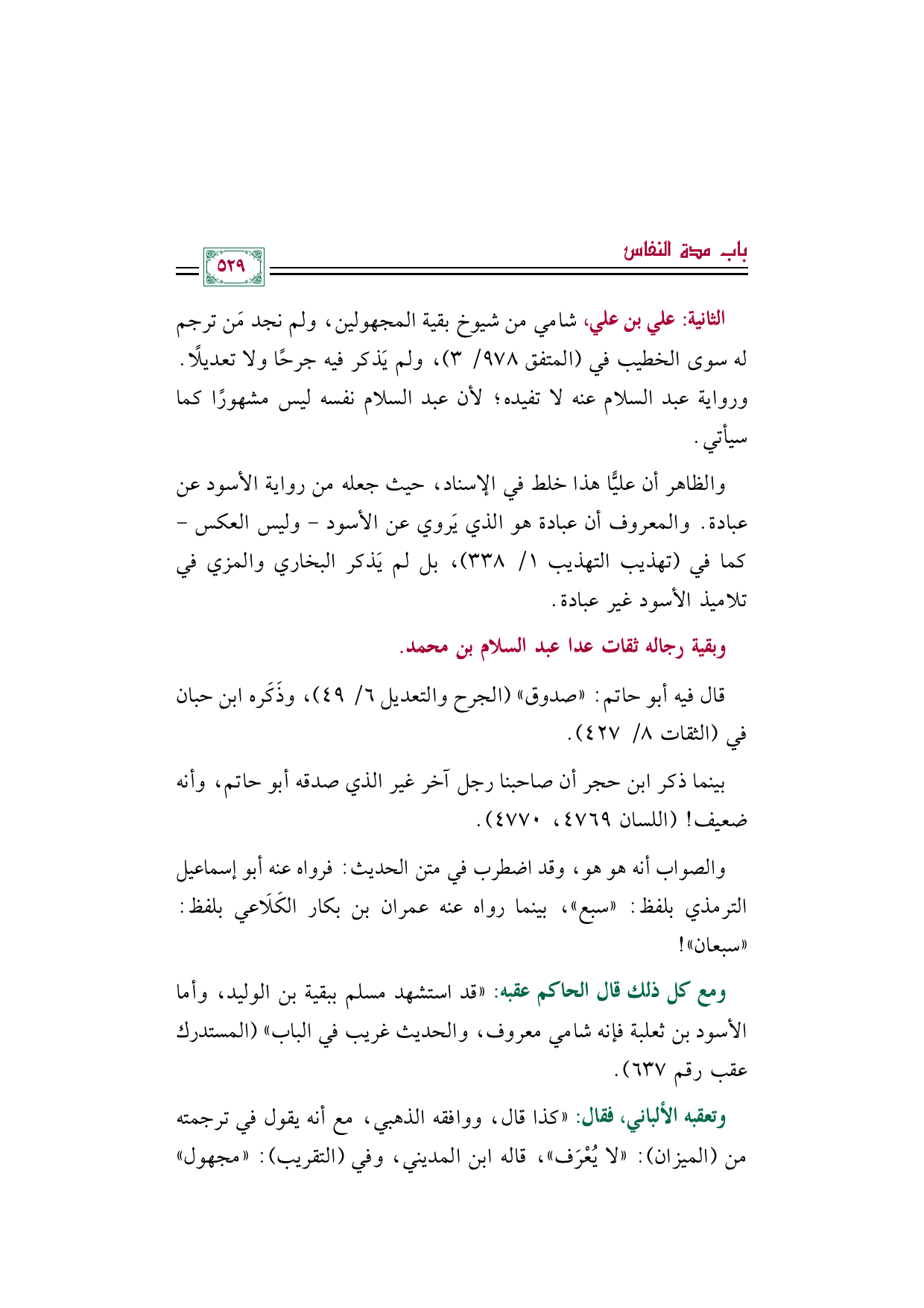 الثانية: علي بن علي، شامي من شيوخ بقية المجهولين، ولم نجد مَن ترجم له سوى الخطيب في (المتفق ٩٧٨/ ٣)، ولم يَذكر فيه جرحًا ولا تعديلًا. ورواية عبد السلام عنه لا تفيده؛ لأن عبد السلام نفسه ليس مشهورًا كما سيأتي.