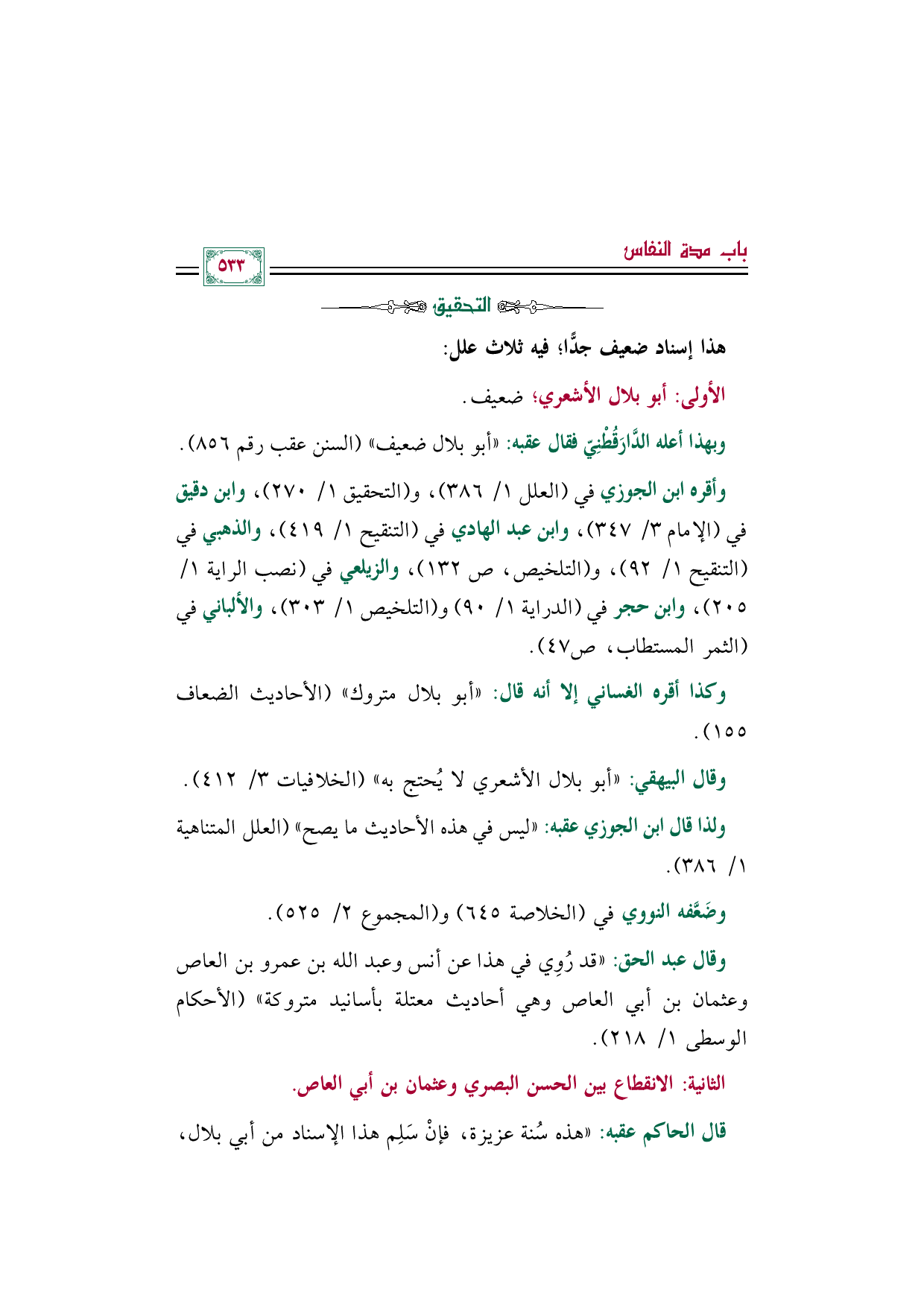 وقال عبد الحق: ((قد رُوِي في هذا عن أنس وعبد الله بن عمرو بن العاص وعثمان بن أبي العاص ... وهي أحاديث معتلة بأسانيد متروكة)) (الأحكام الوسطى ١/ ٢١٨).