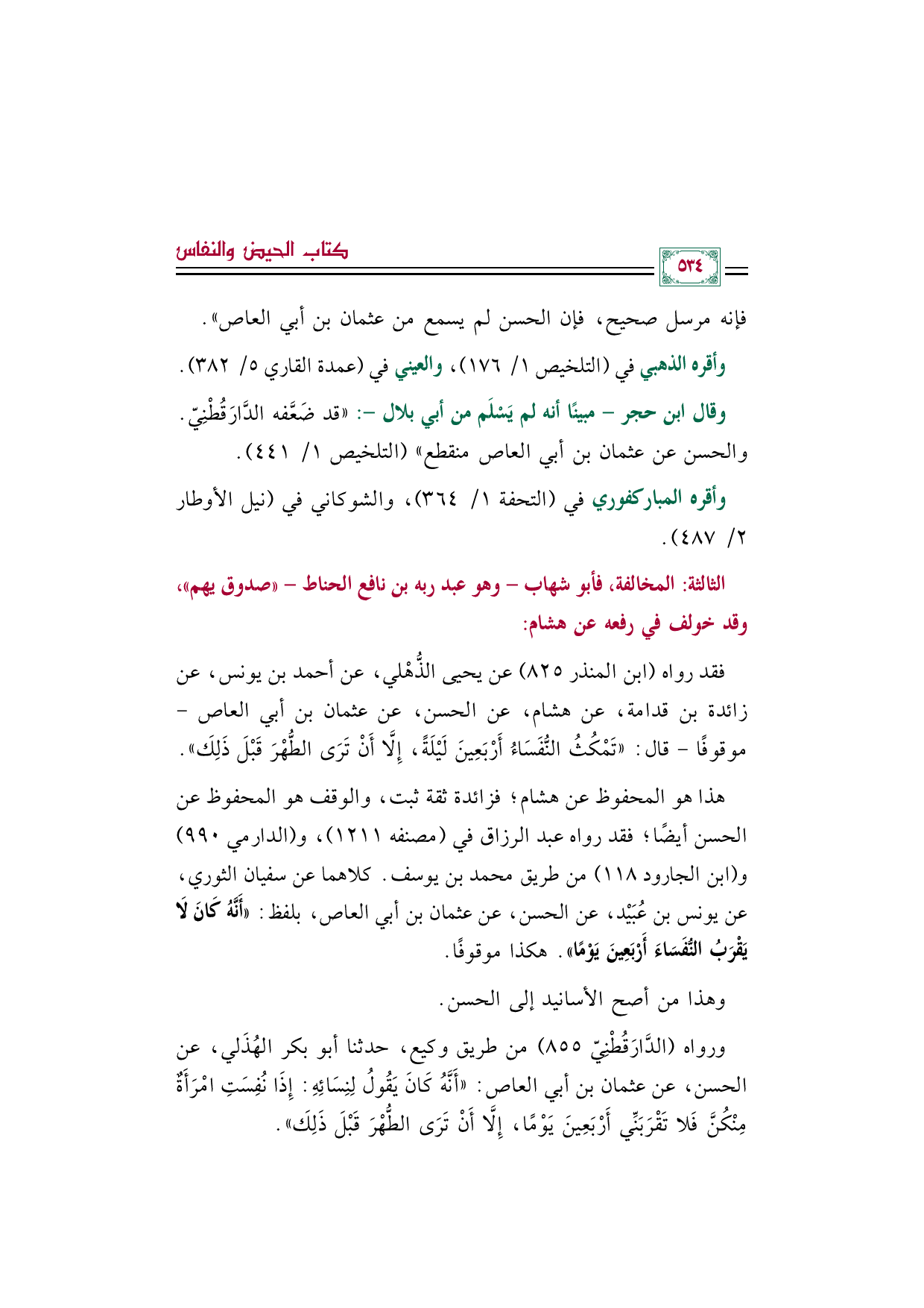 ورواه (الدَّارَقُطْنِيّ ٨٥٥) من طريق وكيع، حدثنا أبو بكر الهُذَلي، عن الحسن، عن عثمان بن أبي العاص: ((أَنَّهُ كَانَ يَقُولُ لِنِسَائِهِ: إِذَا نُفِسَتِ امْرَأَةٌ مِنْكُنَّ فَلا تَقْرَبَنِّي أَرْبَعِينَ يَوْمًا، إِلَّا أَنْ تَرَى الطُّهْرَ قَبْلَ ذَلِكَ)).