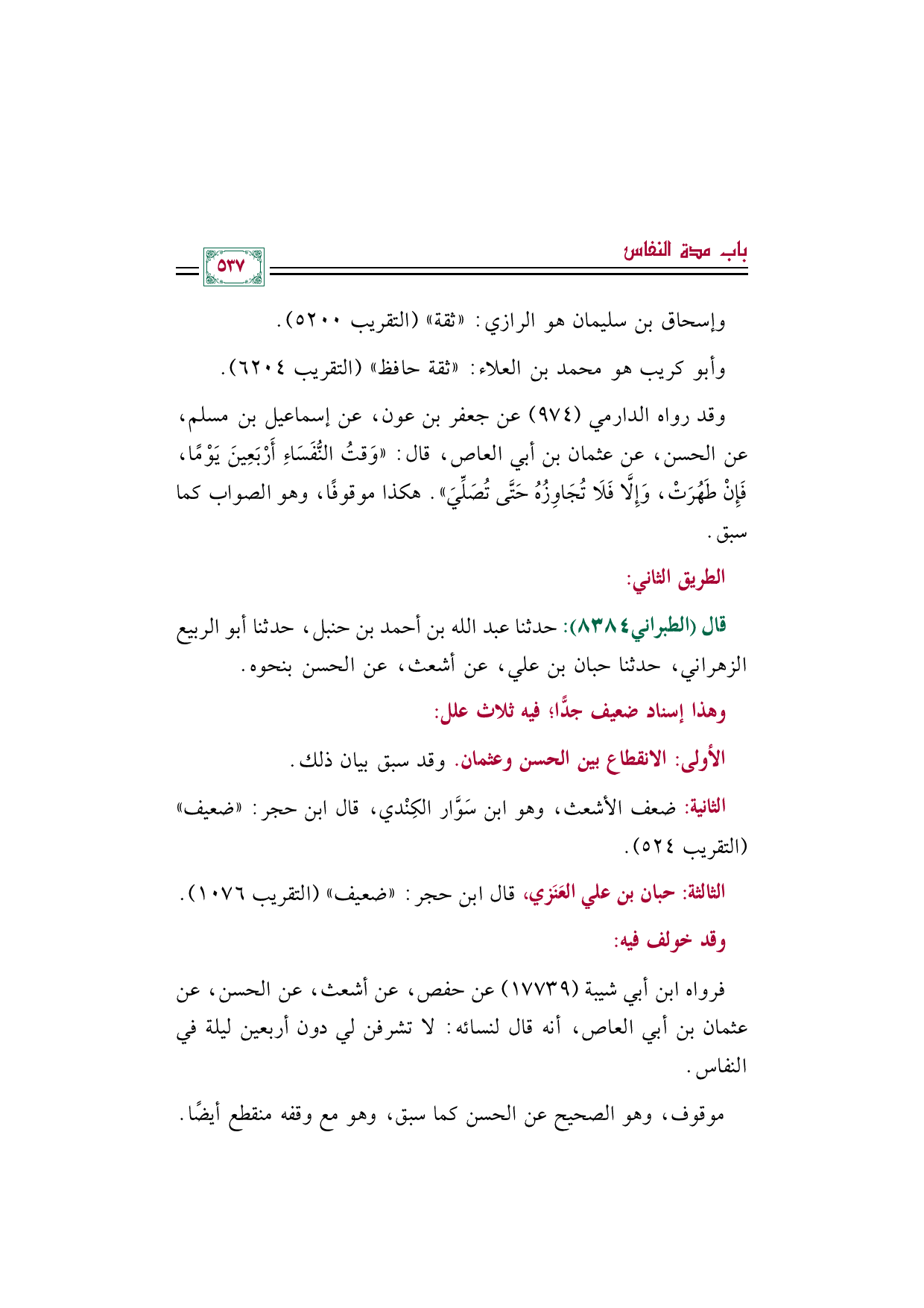 وقد رواه الدارمي (٩٧٤) عن جعفر بن عون، عن إسماعيل بن مسلم، عن الحسن، عن عثمان بن أبي العاص، قال: ((وَقتُ النُّفَسَاءِ أَرْبَعِينَ يَوْمًا، فَإِنْ طَهُرَتْ، وَإِلَّا فَلَا تُجَاوِزُهُ حَتَّى تُصَلِّيَ)). هكذا موقوفًا، وهو الصواب كما سبق.