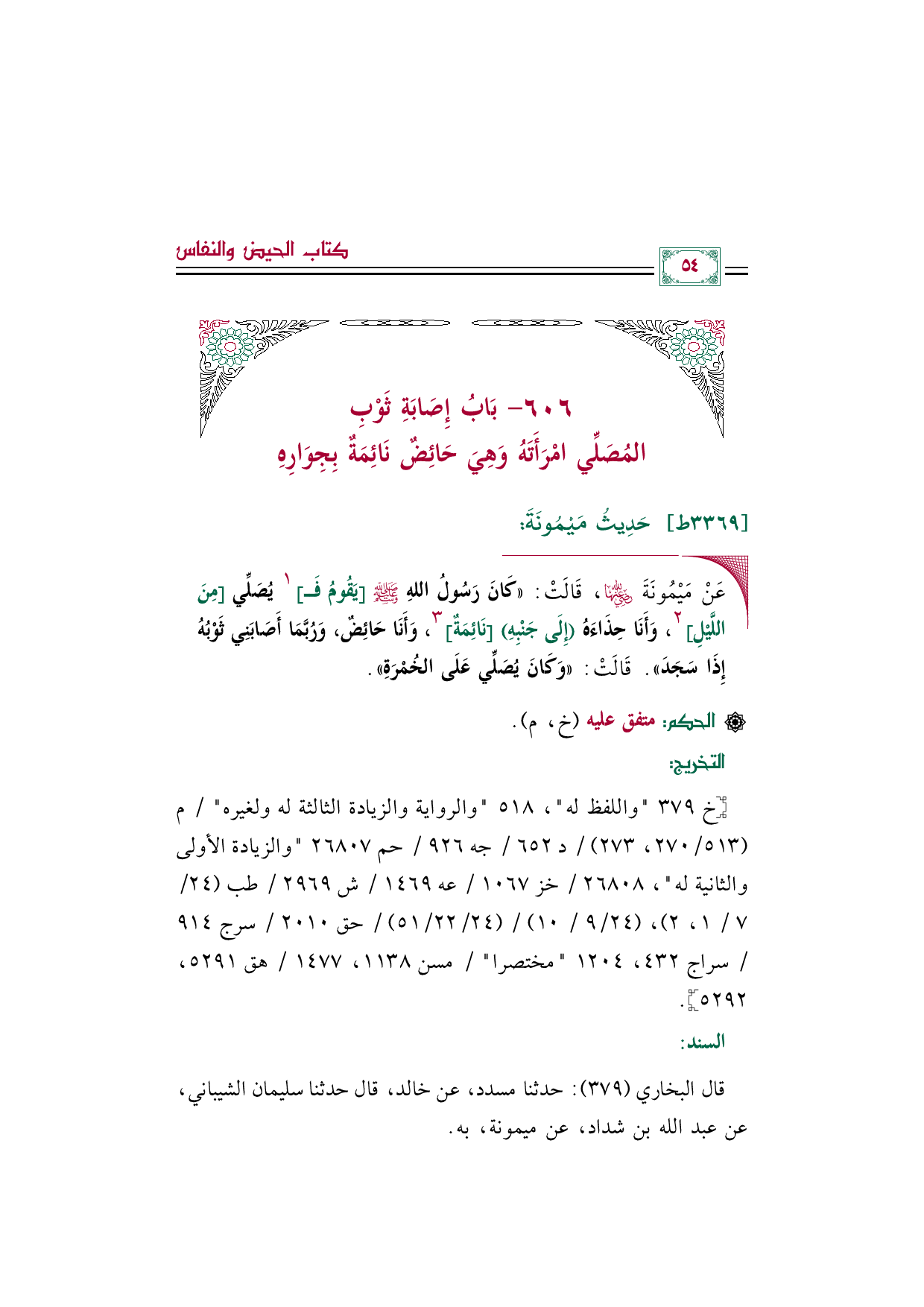 ◼ عَنْ مَيْمُونَةَ رَضِيَ اللهُ عَنْهَا، قَالَتْ: ((كَانَ رَسُولُ اللهِ صَلَّى اللهُ عَلَيْهِ وَسَلَّمَ [يَقُومُ فَـ] ١ يُصَلِّي [مِنَ اللَّيْلِ] ٢، وَأَنَا حِذَاءَهُ (إِلَى جَنْبِهِ) [نَائِمَةٌ] ٣، وَأَنَا حَائِضٌ، وَرُبَّمَا أَصَابَنِي ثَوْبُهُ إِذَا سَجَدَ)). قَالَتْ: ((وَكَانَ يُصَلِّي عَلَى الخُمْرَةِ)).