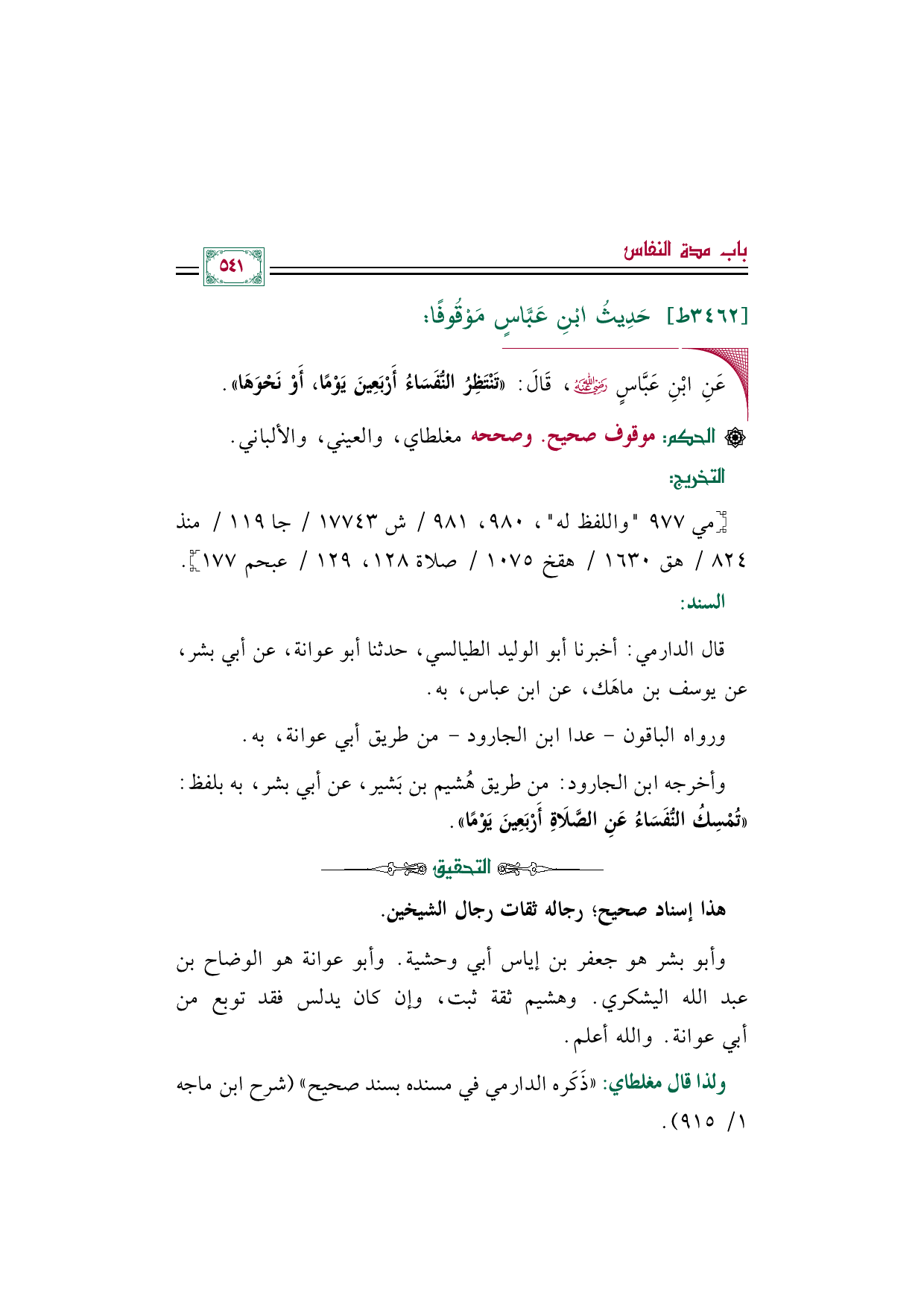 ولذا قال مغلطاي: ((ذَكَره الدارمي في مسنده بسند صحيح)) (شرح ابن ماجه ١/ ٩١٥).