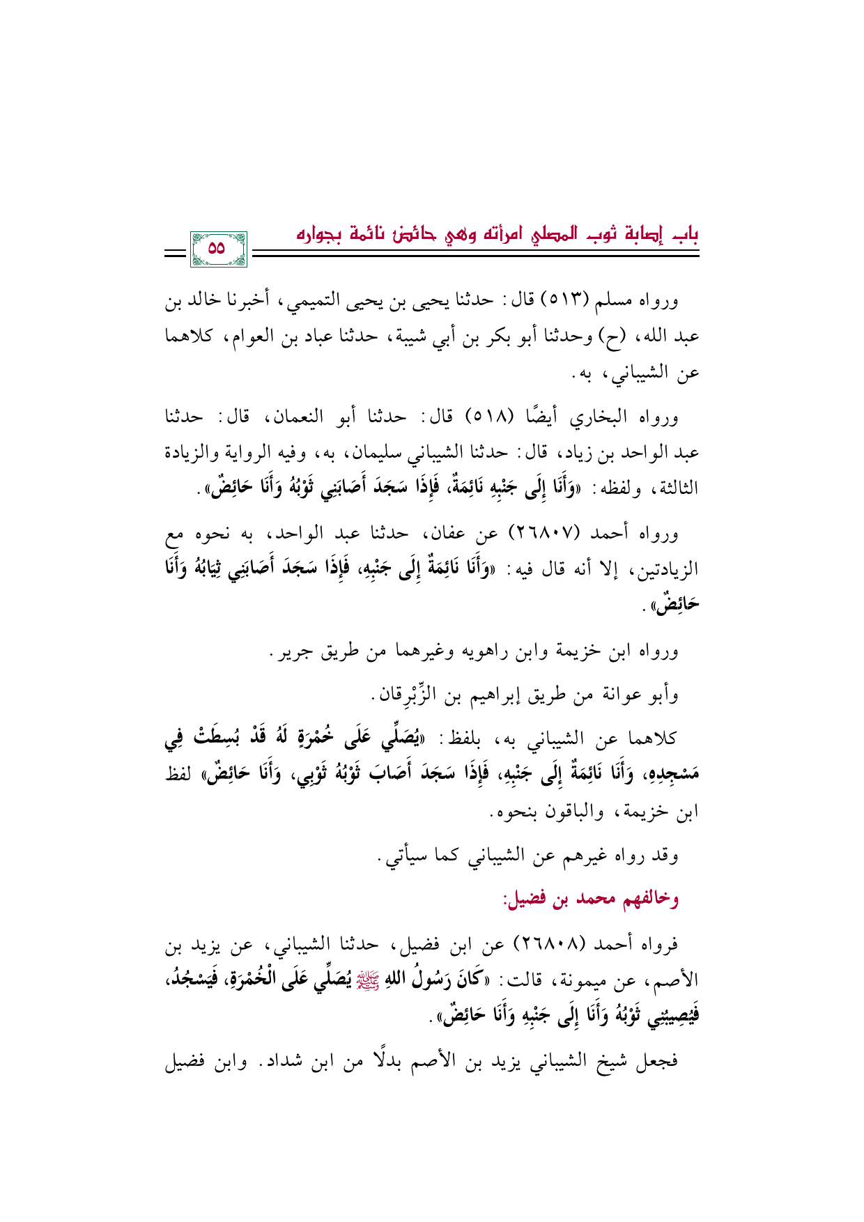 كلاهما عن الشيباني به، بلفظ: ((يُصَلِّي عَلَى خُمْرَةٍ لَهُ قَدْ بُسِطَتْ فِي مَسْجِدِهِ، وَأَنَا نَائِمَةٌ إِلَى جَنْبِهِ، فَإِذَا سَجَدَ أَصَابَ ثَوْبُهُ ثَوْبِي، وَأَنَا حَائِضٌ)) لفظ ابن خزيمة، والباقون بنحوه.