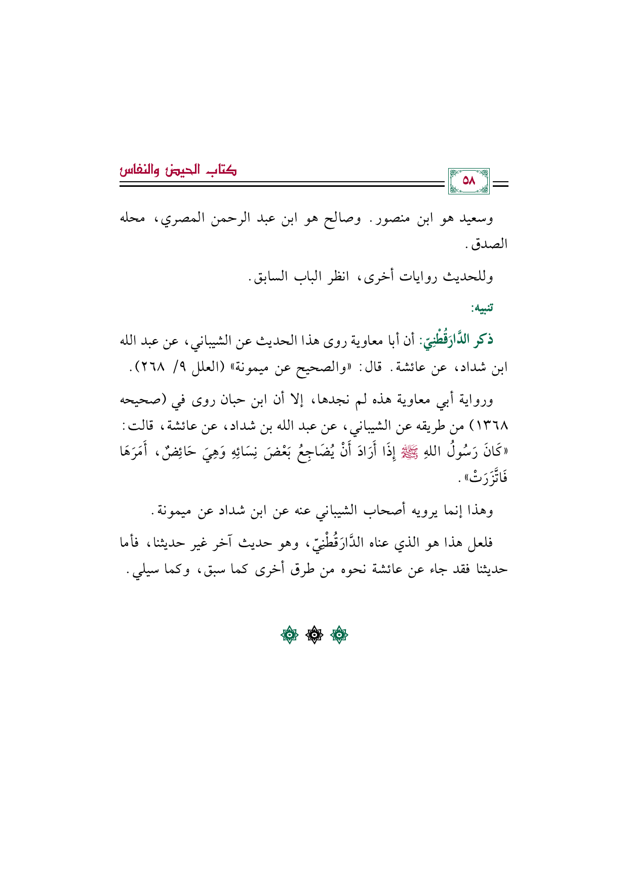 ذكر الدَّارَقُطْنِيّ: أن أبا معاوية روى هذا الحديث عن الشيباني، عن عبد الله بن شداد، عن عائشة. قال: ((والصحيح عن ميمونة)) (العلل ٩/ ٢٦٨).
