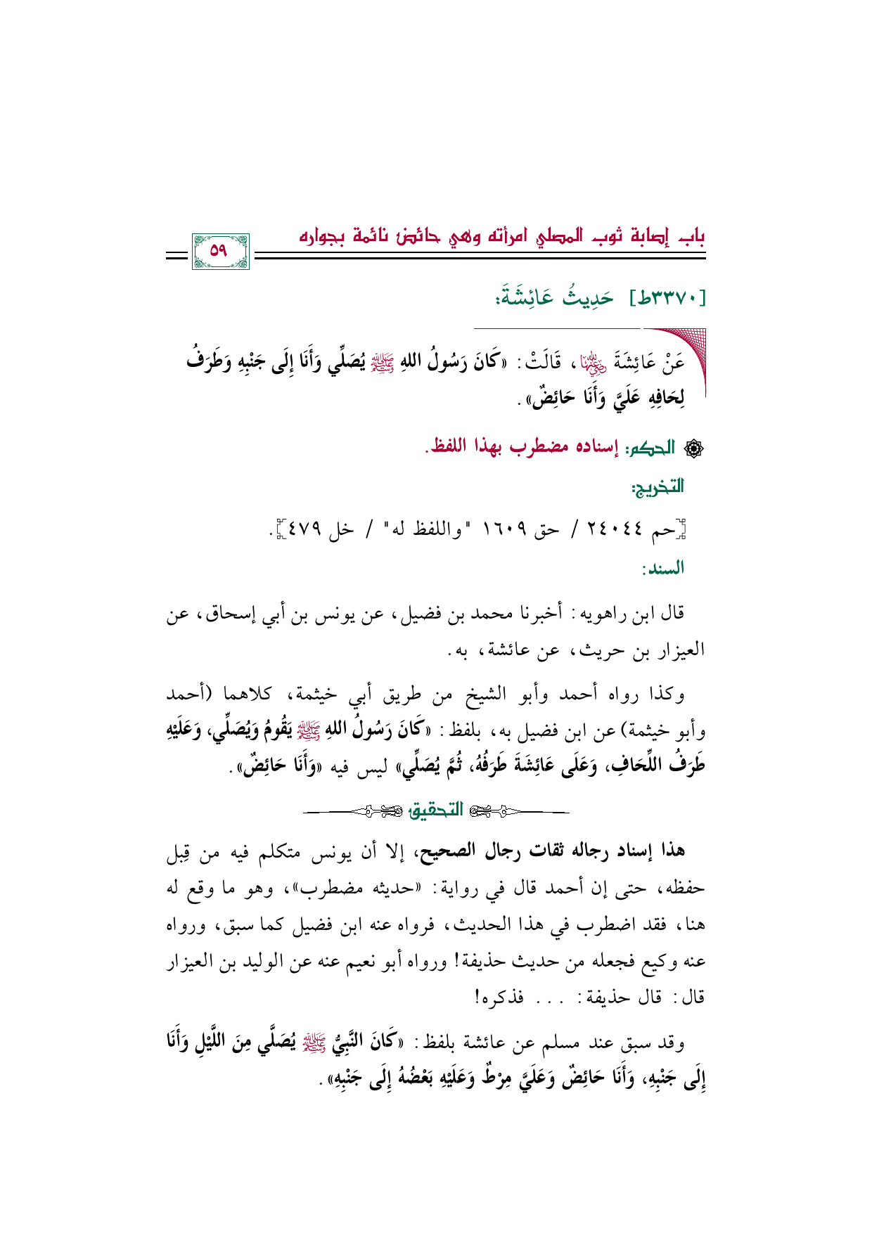 وكذا رواه أحمد وأبو الشيخ من طريق أبي خيثمة، كلاهما (أحمد وأبو خيثمة) عن ابن فضيل به، بلفظ: ((كَانَ رَسُولُ اللهِ صَلَّى اللهُ عَلَيْهِ وَسَلَّمَ يَقُومُ وَيُصَلِّي، وَعَلَيْهِ طَرَفُ اللِّحَافِ، وَعَلَى عَائِشَةَ طَرَفُهُ، ثُمَّ يُصَلِّي)) ليس فيه ((وَأَنَا حَائِضٌ)).