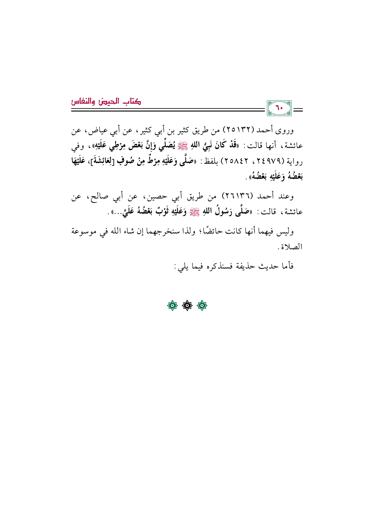 وليس فيهما أنها كانت حائضًا؛ ولذا سنخرجهما إن شاء الله في موسوعة الصلاة.