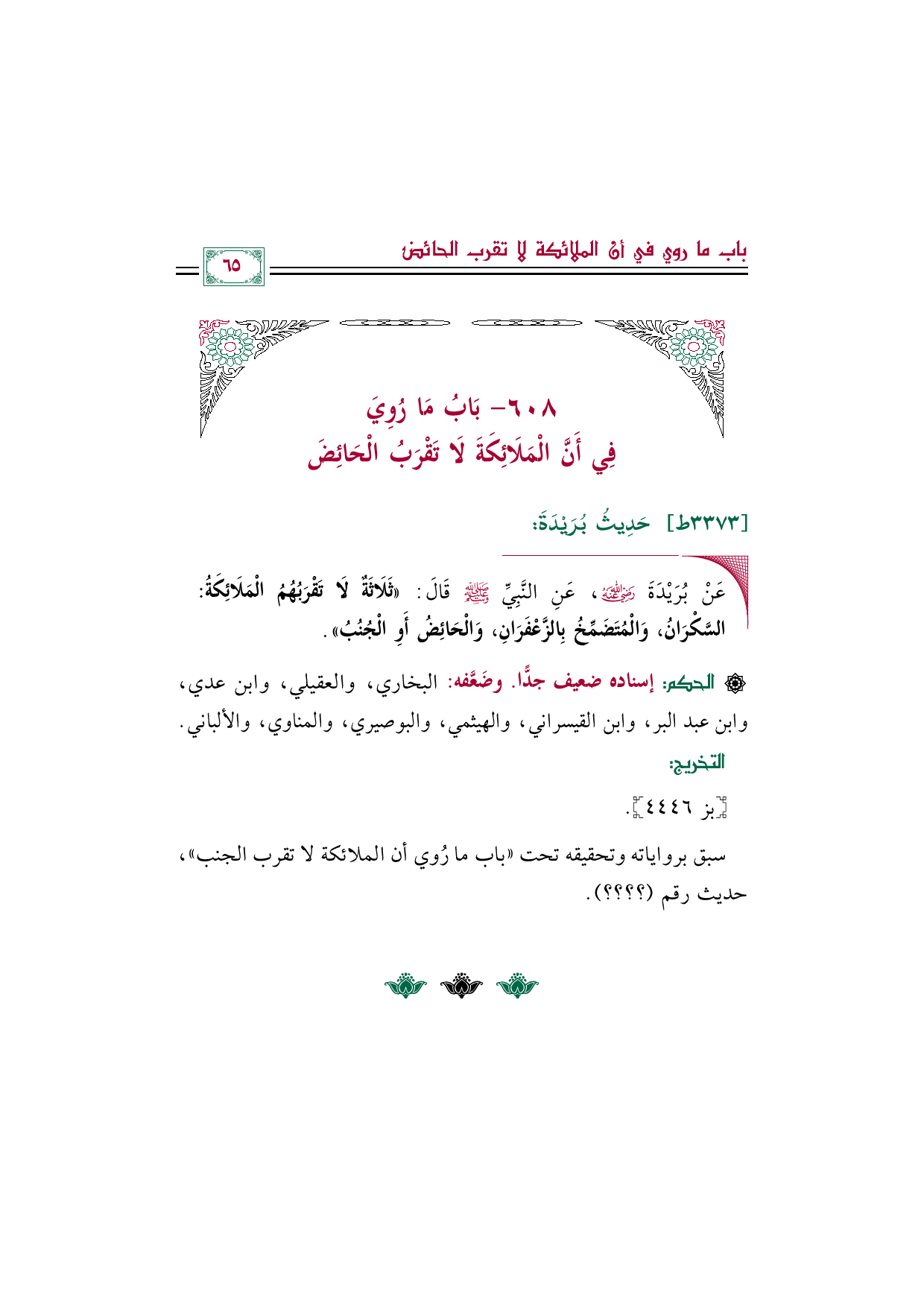 ◼ عَنْ بُرَيْدَةَ رَضِيَ اللهُ عَنْهُ، عَنِ النَّبِيِّ صَلَّى اللهُ عَلَيْهِ وَسَلَّمَ قَالَ: ((ثَلَاثَةٌ لَا تَقْرَبُهُمُ الْمَلَائِكَةُ: السَّكْرَانُ، وَالْمُتَضَمِّخُ بِالزَّعْفَرَانِ، وَالْحَائِضُ أَوِ الْجُنُبُ)).
