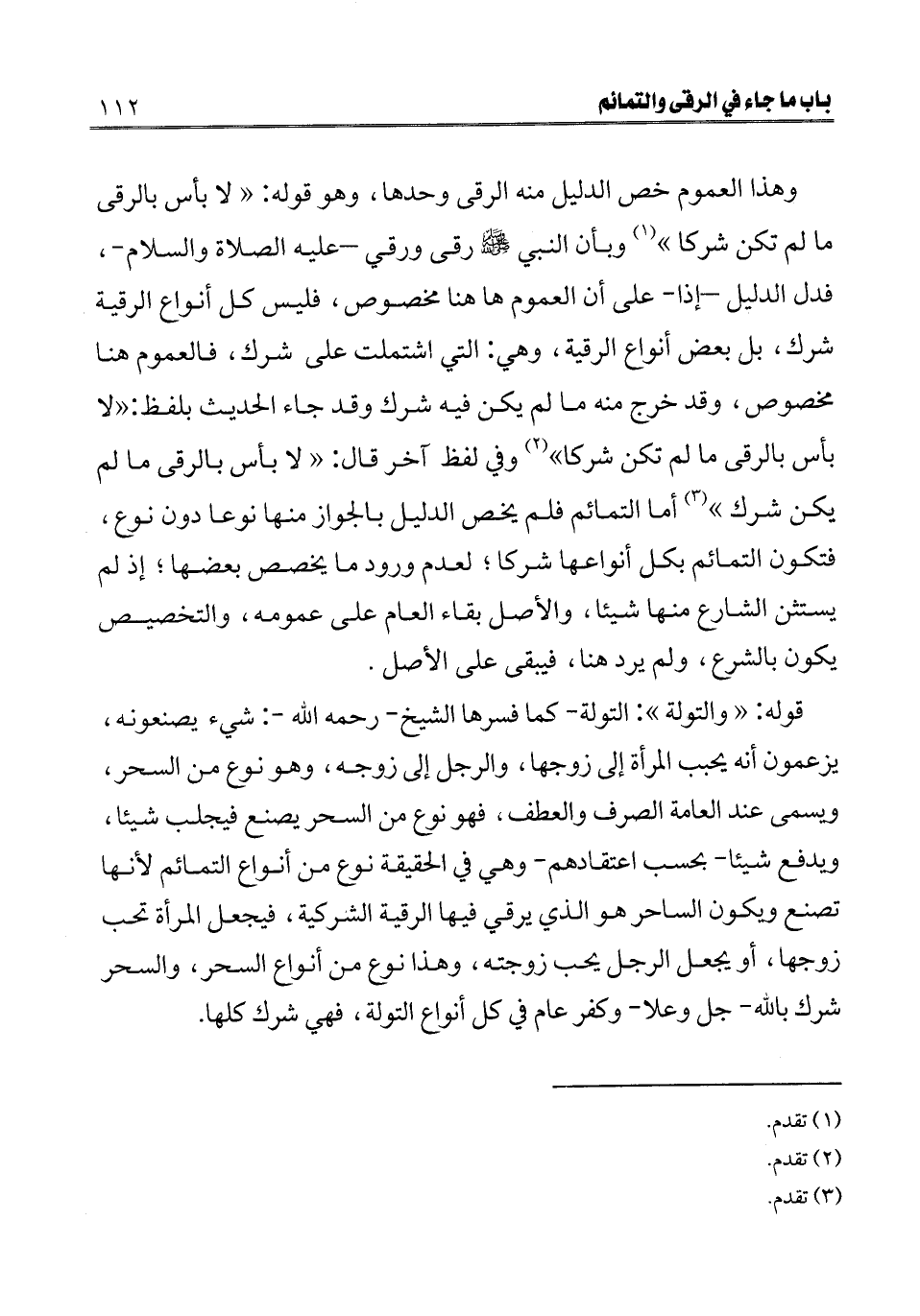 قوله: " والتولة ": التولة كما فسرها الشيخ - رحمه الله -: شيء يصنعونه، يزعمون أنه يحبب المرأة إلى زوجها، والرجل إلى زوجه، وهو نوع من السحر، ويسمى عند العامة الصرف والعطف، فهو نوع من السحر يصنع فيجلب شيئا، ويدفع شيئا - بحسب اعتقادهم - وهي في الحقيقة نوع من أنواع التمائم لأنها تصنع ويكون الساحر هو الذي يرقي فيها الرقية الشركية، فيجعل المرأة تحب زوجها، أو يجعل الرجل يحب زوجته، وهذا نوع من أنواع السحر، والسحر شرك بالله - جل وعلا - وكفر عام في كل أنواع التولة، فهي شرك كلها.