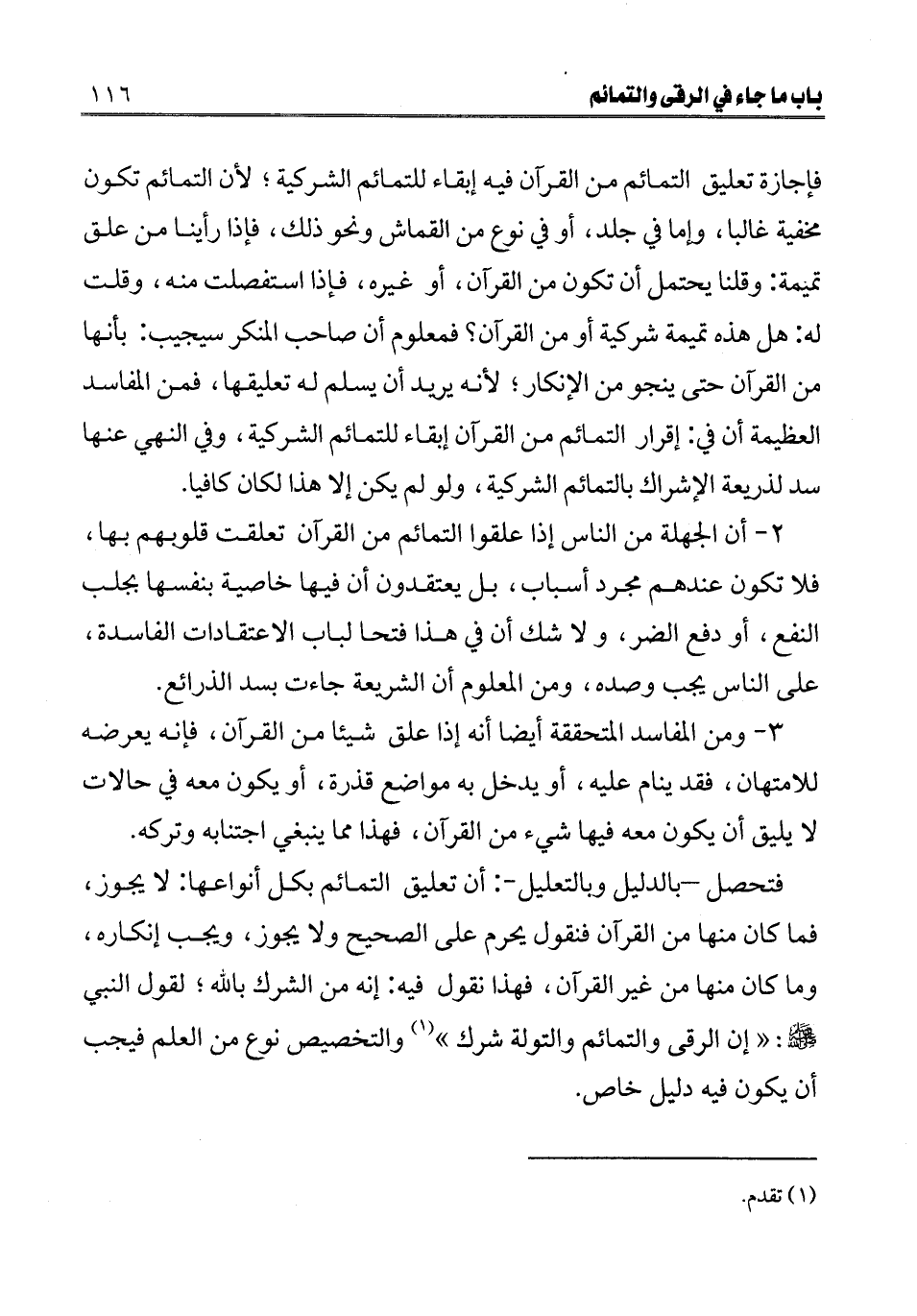 ـــــــــــــــــــــــــــــQفإجازة تعليق التمائم من القرآن فيه إبقاء للتمائم الشركية؛ لأن التمائم تكون مخفية غالبا، وإما في جلد، أو في نوع من القماش ونحو ذلك، فإذا رأينا من علق تميمة: وقلنا يحتمل أن تكون من القرآن، أو غيره، فإذا استفصلت منه، وقلت له: هل هذه تميمة شركية أو من القرآن؟ فمعلوم أن صاحب المنكر سيجيب: بأنها من القرآن حتى ينجو من الإنكار؛ لأنه يريد أن يسلم له تعليقها، فمن المفاسد العظيمة أن في: إقرار التمائم من القرآن إبقاء للتمائم الشركية، وفي النهي عنها سد لذريعة الإشراك بالتمائم الشركية، ولو لم يكن إلا هذا لكان كافيا.