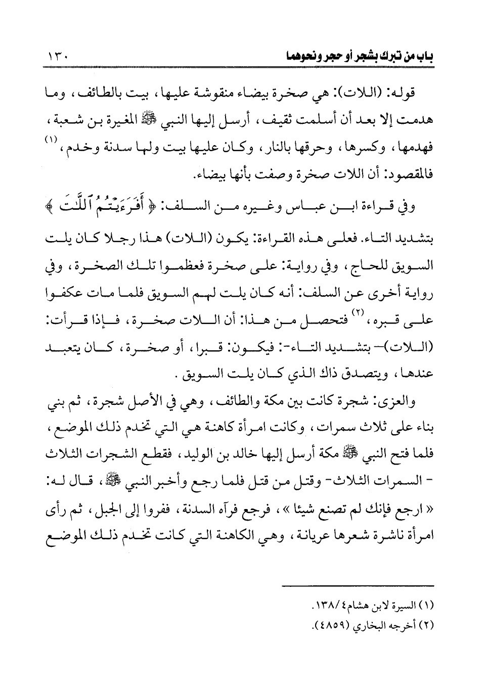 ـــــــــــــــــــــــــــــQقوله: (اللات) : هي صخرة بيضاء منقوشة عليها، بيت بالطائف، وما هدمت إلا بعد أن أسلمت ثقيف، أرسل إليها النبي صلى الله عليه وسلم المغيرة بن شعبة، فهدمها، وكسرها، وحرقها بالنار، وكان عليها بيت ولها سدنة وخدم، (¬1) فالمقصود: أن اللات صخرة وصفت بأنها بيضاء.
