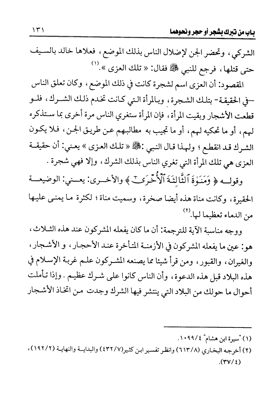 وقوله، {وَمَنَاةَ الثَّالِثَةَ الْأُخْرَى} [النجم: 20] والأخرى: يعني: الوضيعة الحقيرة، وكانت مناة هذه أيضا صخرة، وسميت مناة؛ لكثرة ما يمنى عليها من الدماء تعظيما لها (¬2) ووجه مناسبة الآية للترجمة: أن ما كان يفعله المشركون عند هذه الثلاث، هو عين ما يفعله المشركون في الأزمنة المتأخرة عند الأحجار، والأشجار، والغيران، والقبور ومن قرأ شيئا مما يصنعه المشركون علم غربة الإسلام في هذه البلاد قبل هذه الدعوة، وأن الناس كانوا على شرك عظيم. وإذا تأملت أحوال ما حولك من البلاد التي ينتشر فيها الشرك وجدت من اتخاذ الأشجار
