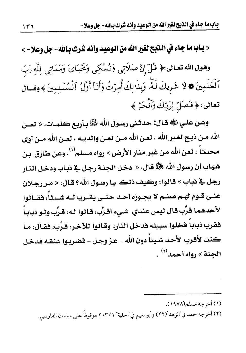 " باب ما جاء في الذبح لغير الله من الوعيد وأنه شرك بالله - جل وعلا - " وقول الله تعالى: {قُلْ إِنَّ صَلَاتِي وَنُسُكِي وَمَحْيَايَ وَمَمَاتِي لِلَّهِ رَبِّ الْعَالَمِينَ - لَا شَرِيكَ لَهُ وَبِذَلِكَ أُمِرْتُ وَأَنَا أَوَّلُ الْمُسْلِمِينَ} [الأنعام: 162 - 163] وقال تعالى: {فَصَلِّ لِرَبِّكَ وَانْحَرْ} [الكوثر: 2] وعن علي رضي الله عنه قال: حدثني رسول الله صلى الله عليه وسلم بأربع كلمات: «لعن الله من ذبح لغير الله، لعن الله من لعن والديه، لعن الله من آوى محدثا، لعن الله من غير منار الأرض» رواه مسلم (¬1) . وعن طارق بن شهاب أن رسول الله صلى الله عليه وسلم قال: «دخل الجنة رجل في ذباب ودخل النار رجل في ذباب " قالوا: وكيف ذلك يا رسول الله؟ قال: " مر رجلان على قوم لهم صنم لا يجوزه أحد حتى يقرب له شيئا، فقالوا لأحدهما قرّب، قال: ليس عندي شيء أقرّب، قالوا له: قرّب ولو ذبابا، فقرّب ذبابا، فخلوا سبيله فدخل النار، وقالوا للآخر: قرّب، فقال: ما كنت لأقرب لأحد شيئا دون الله - عز وجل - فضربوا عنقه فدخل الجنة» رواه أحمد (¬2) .